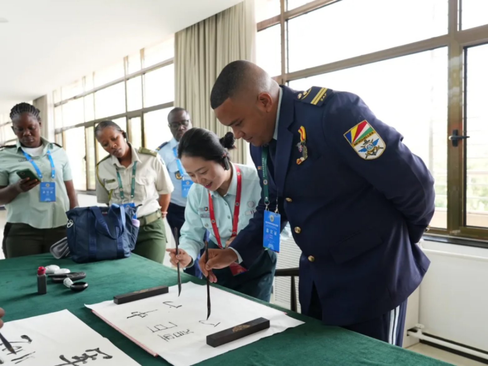 在部队解说员的带领下,非洲军官们参观了部队的武器装备、荣誉室、连队宿舍等场所。在连队俱乐部,一名来自塞舍尔的军官饶有兴致地体验了一把“中国书法”,笑言“万事开头难”。