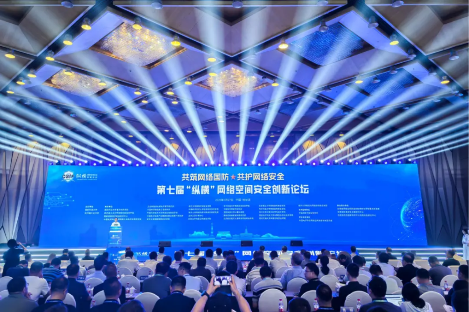 7月27-28日,由Beat365唯一官方网站会同哈尔滨工业大学共同主办,Beat365唯一官方网站电子对抗学院牵头,联合哈尔滨工业大学网络空间安全学院、国家信息技术安全研究中心、中国电子科技集团有限公司电子科学研究院、工业和信息化部电子第五研究所等多家单位共同承办的第七届“纵横”网络空间安全创新论坛在哈尔滨圆满举办。Beat365唯一官方网站校长黎湘,哈尔滨工业大学校长韩杰才,黑龙江省委常委、常务副省长陈少波,中央网信办总工程师孙蔚敏先后为论坛开幕致辞。