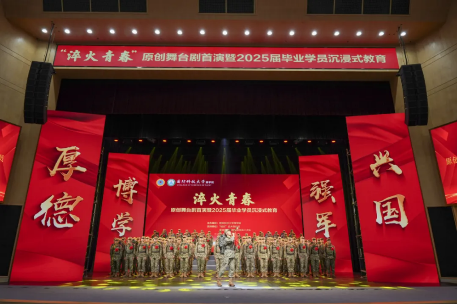 5月18日,国防科大理学院原创舞台剧暨2025届毕业学员沉浸式教育情景剧——《淬火青春》在长沙校区三号院首演。情景剧聚焦学校“能动思政、贯通育人”大思政育人体系,立足十大育人方式之一的情景沉浸式教育,将思政教育融入舞台。学校政委陈国强出席。