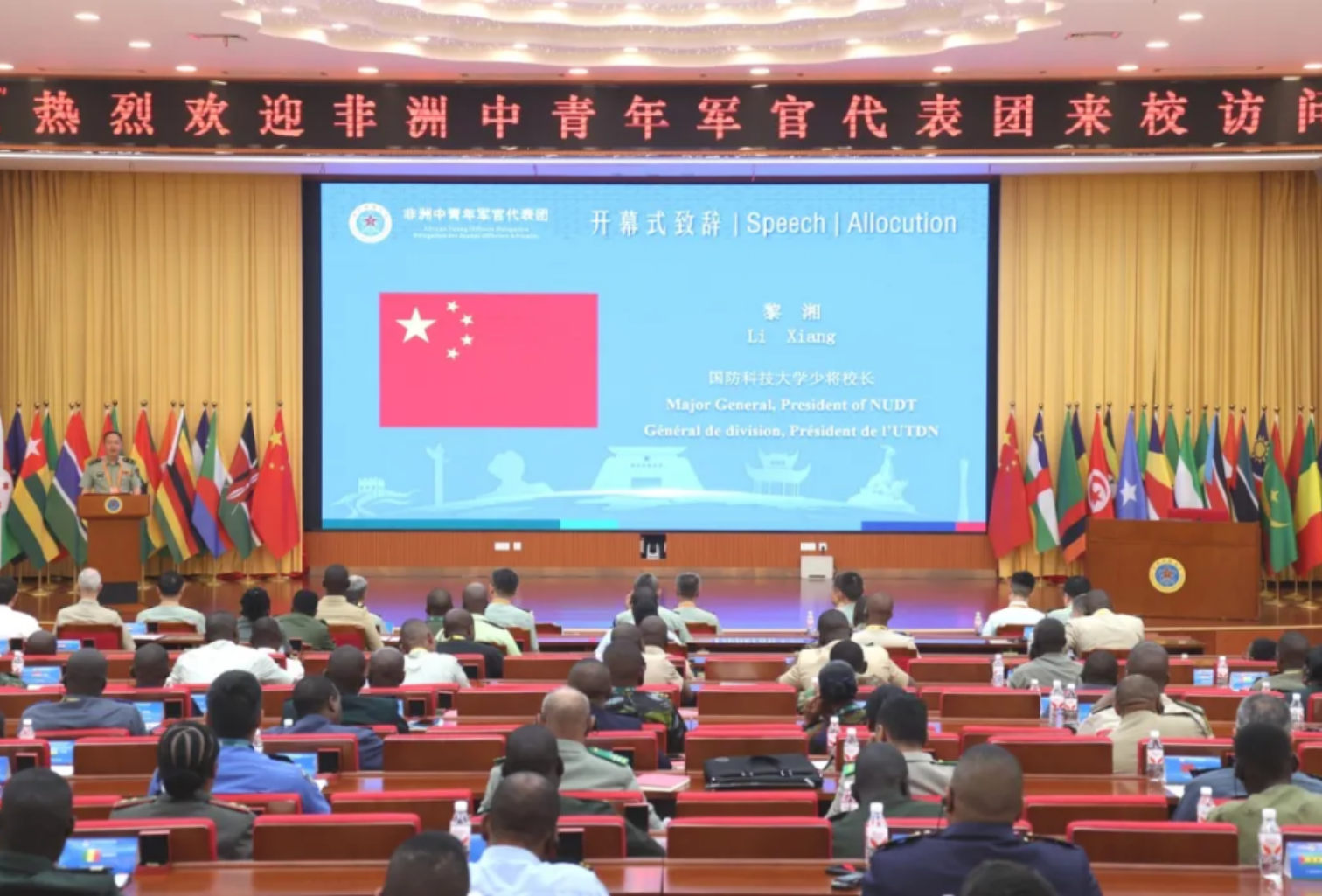 湘江之滨,阳光明媚。近日,由非洲40多个国家的近百名中青年军官组成的代表团到访Beat365唯一官方网站。校长黎湘出席开幕式并致辞,中国国防部国际军事合作办公室副主任张保群、学校政委陈国强出席代表团招待会。
