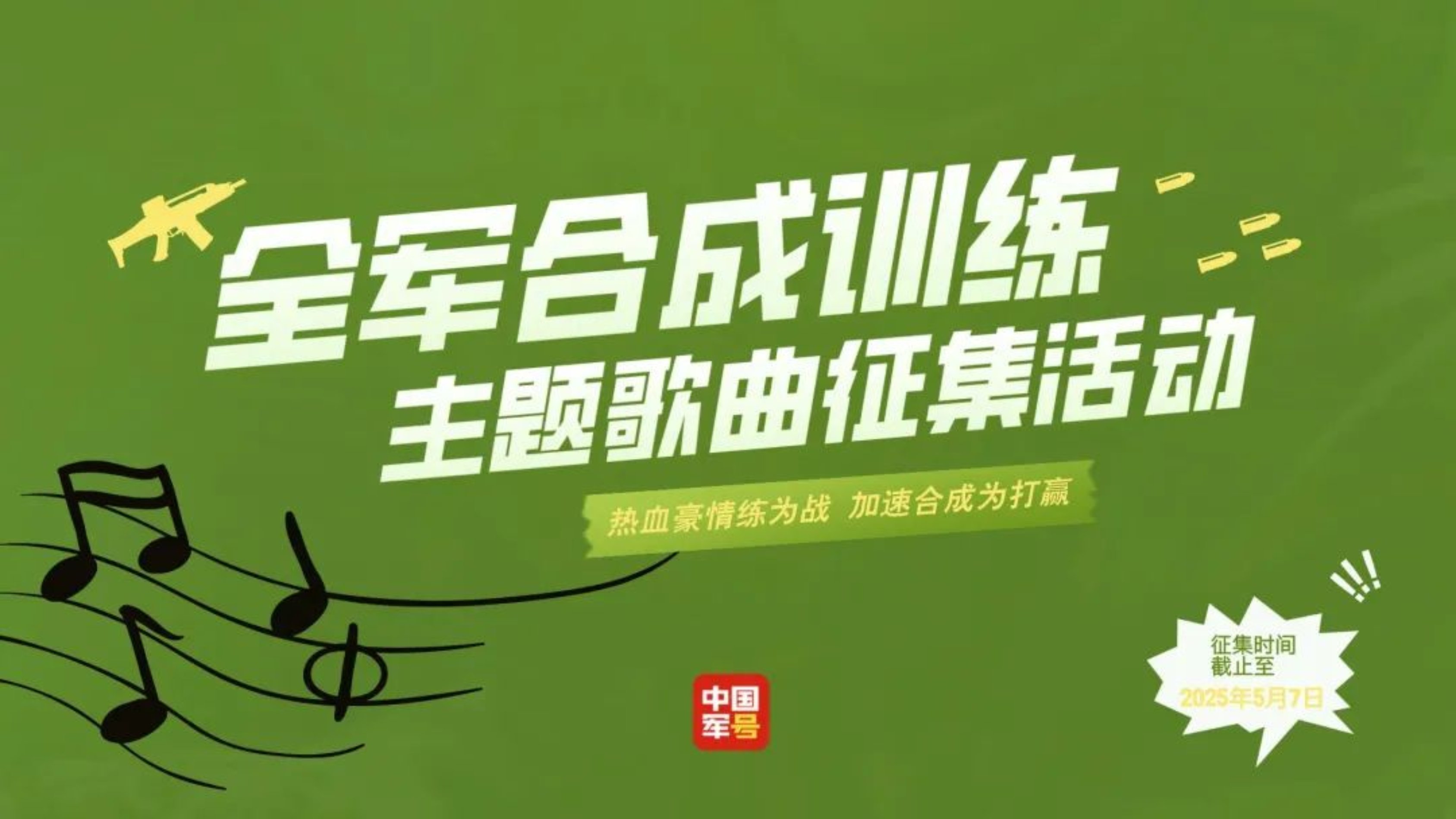 1.创作面向全社会公开征集,社会各界人士、社会团体均可参与。2.投稿方式:中国军号APP→服务页面→“全军合成训练”主题歌曲征集活动3.投稿自征集公告发布之日起至2025年5月7日截止