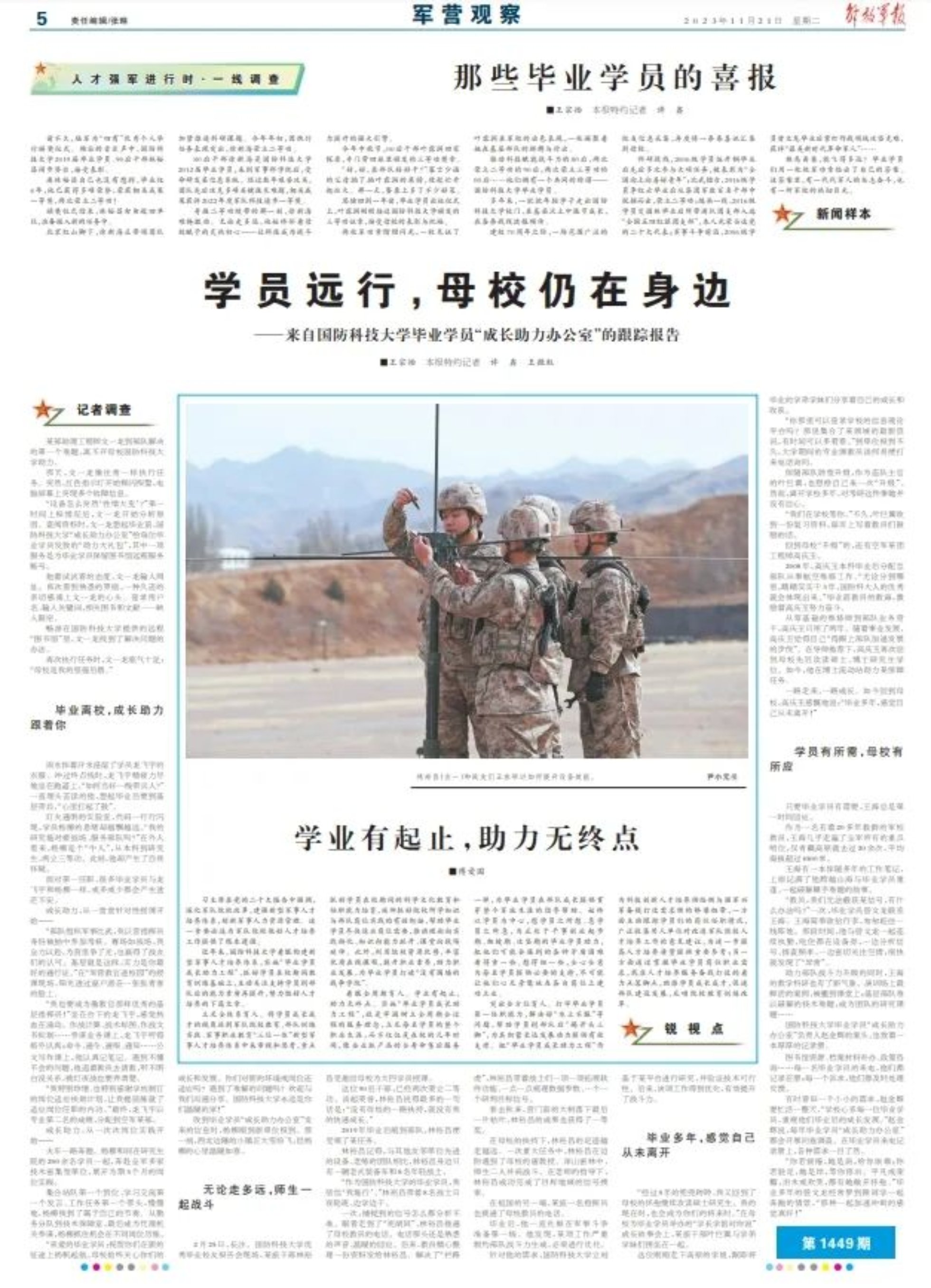 科研战线,2006级学员伍升钢毕业后先后多次参与大项任务,被表彰为“全国向上向善好青年”;比武擂台,2016级学员李红云毕业后从集团军数百名干部中脱颖而出,荣立二等功;练兵一线,2016级学员艾园林毕业后所带连队团支部入选“全国五四红旗团支部”,本人光荣当选党的二十大代表;军事斗争前沿,2006级学员曾文龙毕业后紧盯作战领域攻坚克难,获评“最美新时代革命军人”……