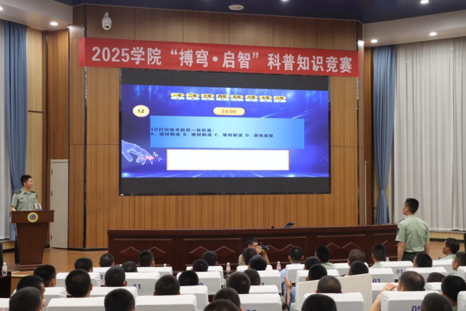 在决赛现场,学员们积极思考、踊跃答题,展现了扎实的科学素养和敏锐的思维能力。本次科普知识竞赛不仅是一场知识的较量,更是一场科技精神的传递。通过活动,学员们不仅收获了科学知识,更感受到了科技创新对国家军队发展的重要性。一位参赛学员表示:“这次竞赛让我对科技有了更深刻的认识,也让我更加坚定了未来投身科技创新事业的决心。”