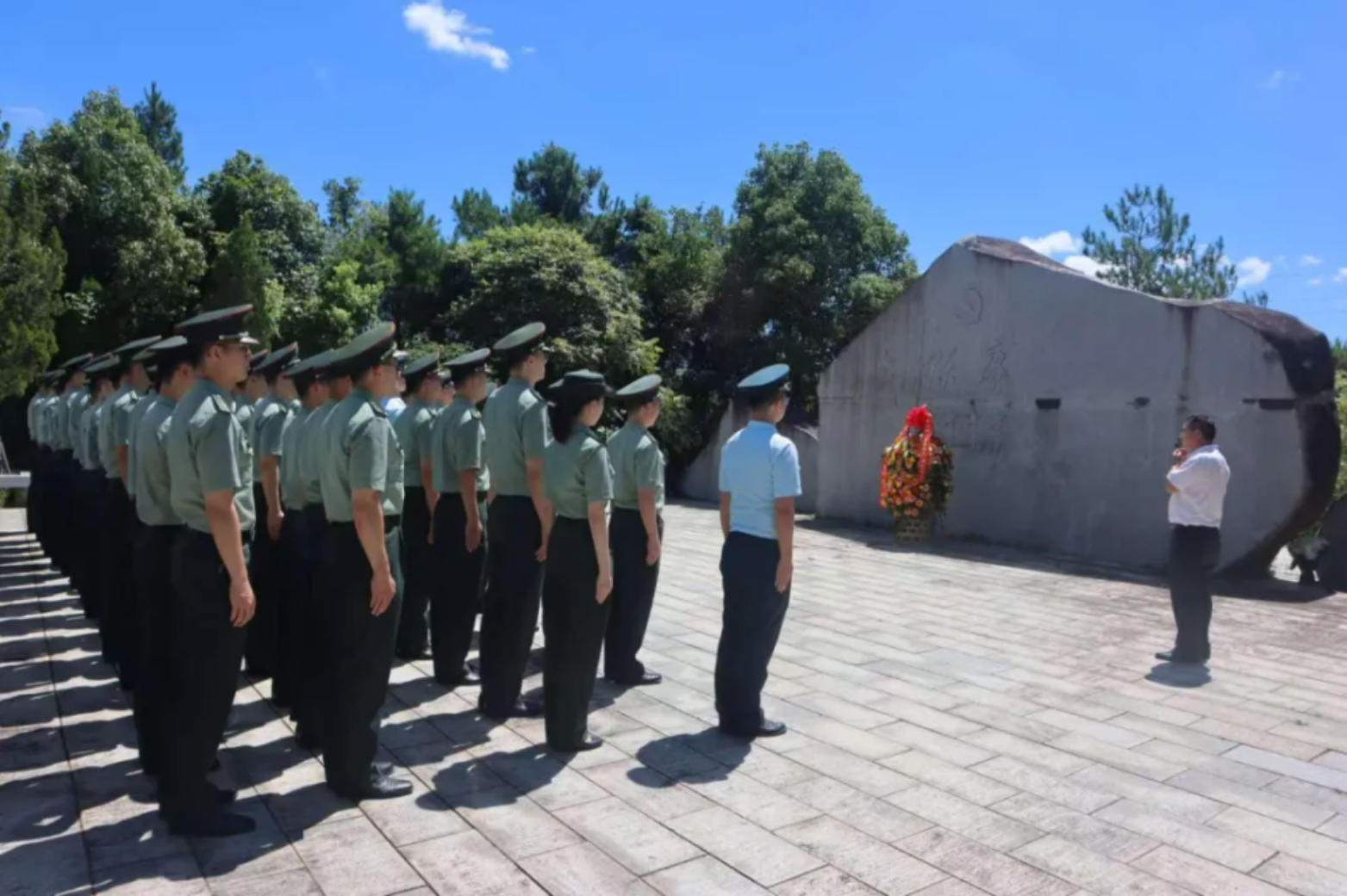 在陈赓夫妇墓园,院领导、全体毕业学员及湘乡市委、驻地武装部领导列队肃立,庄严举行敬献花篮仪式。刘琳政委缓步上前整理花篮缎带,全体人员鞠躬致敬,表达对这位“哈军工”创始人的深切缅怀。此次瞻仰活动,让即将毕业的研究生们深刻感受到老一辈革命家的崇高精神,进一步坚定了他们投身国防、科技报国的信念。