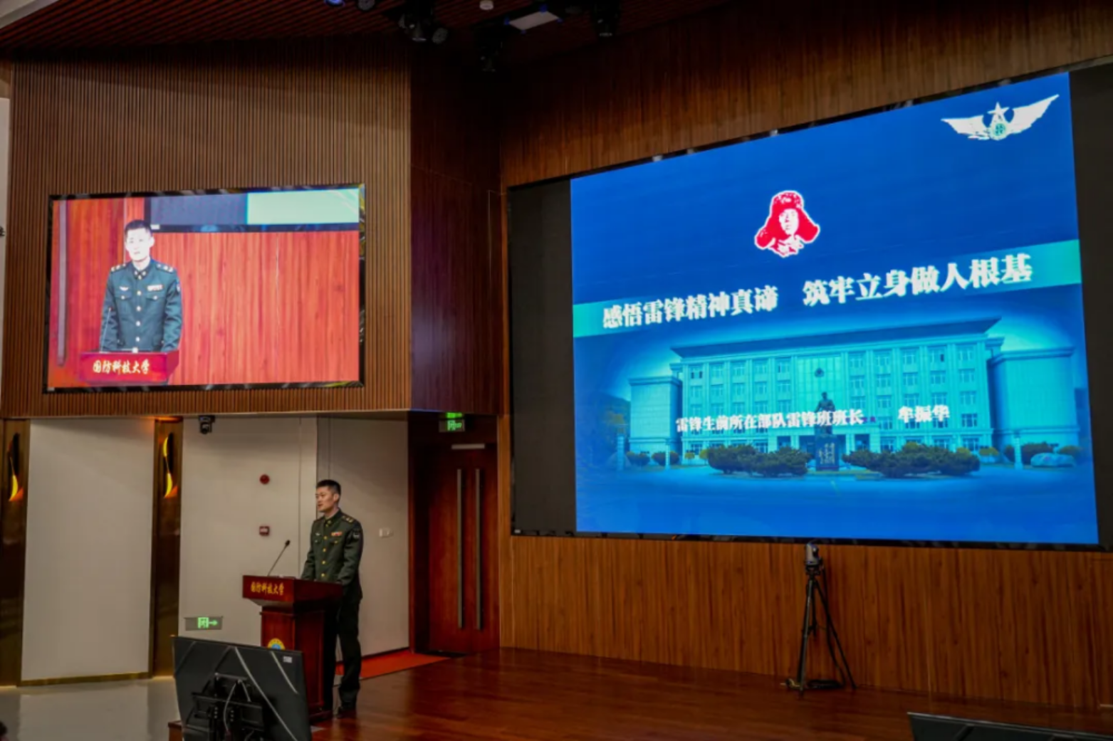电子科学学院某学员大队举行“雷锋精神薪火相传”访谈交流会,邀请湖南雷锋纪念馆、武警长沙支队望城中队及雷锋生前所在部队“雷锋班”的学雷锋先进模范代表分享心得体会。会上,学院与长沙市雷锋学校共同完成“雷锋精神”火种点燃仪式,为青年学员呈现了一堂生动的红色思政课。活动通过模范事迹分享和互动交流,激励学员们传承雷锋精神,争做新时代雷锋传人。