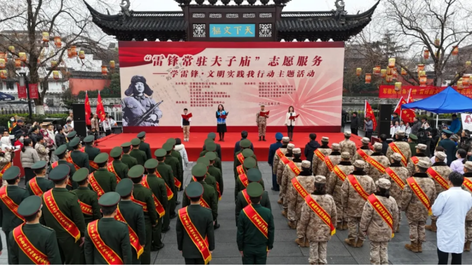 气象海洋学院南京营区师生与第六十三研究所联合驻地政府和兄弟单位,在南京市夫子庙、玄武湖和标营三地开展“雷锋常驻夫子庙”“双拥文明玄武湖”“雷锋传人在标营”等双拥特色品牌活动。活动中,“我为雷锋点个赞”“我与雷锋合个影”等互动环节吸引市民踊跃参与,激励大家传承雷锋精神、讲好雷锋故事、争做时代先锋。