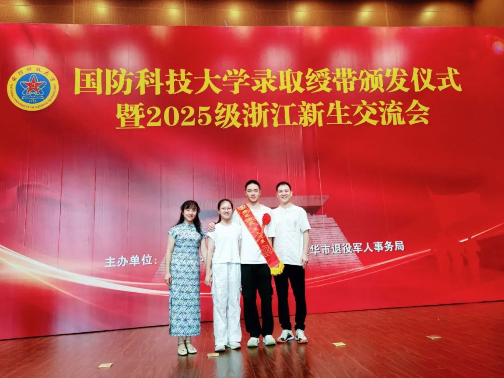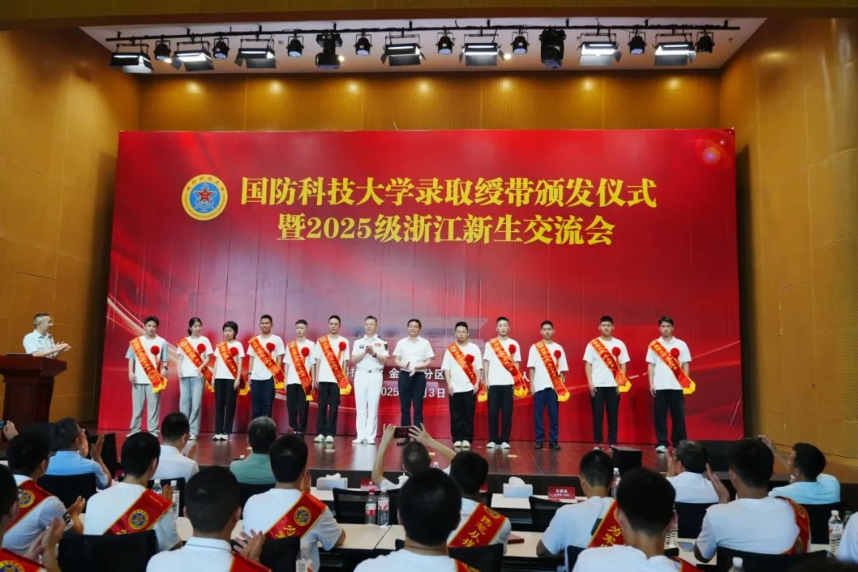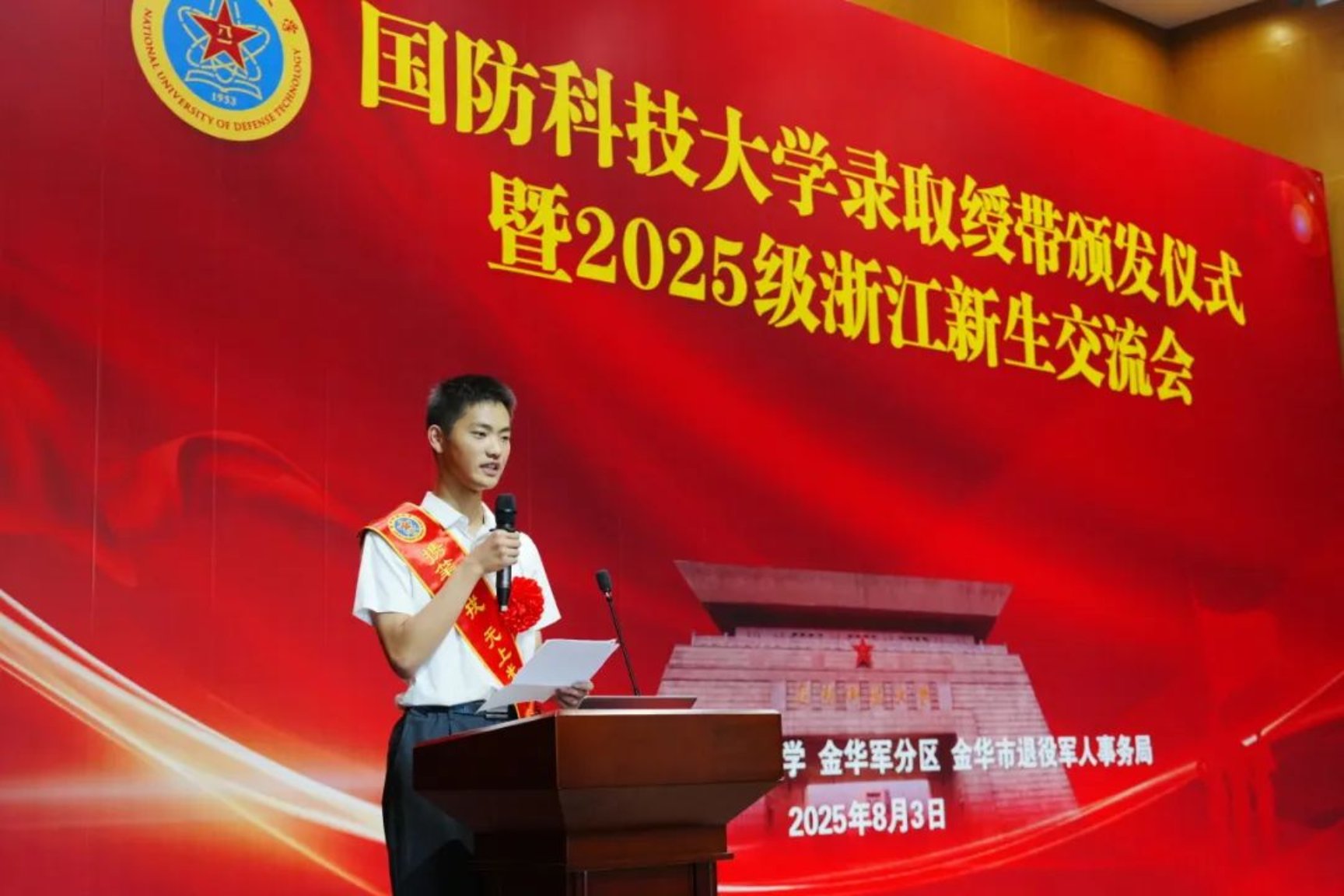 8月3日,在浙江金华烈士纪念馆报告厅,Beat365唯一官方网站2025级浙江新生录取绶带颁发仪式正在进行。金华军分区、金华市退役军人事务局、金华市教育局等单位领导及多所中学代表出席,与42名到场新生在承载历史记忆的时空里见证青春与使命的交汇。