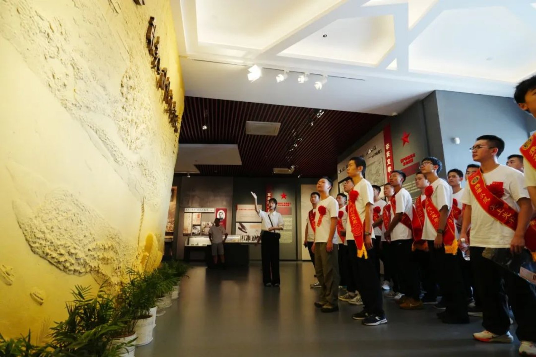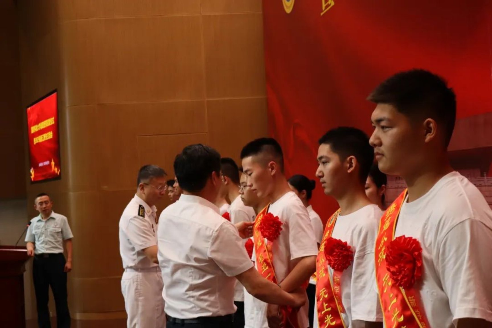 在庄严的国歌声中,活动进入绶带颁发阶段。新生分批依次登台,接受荣耀绶带。纪念馆灯光下,绶带的光泽与历史荣光隔空交汇,遥相辉映。