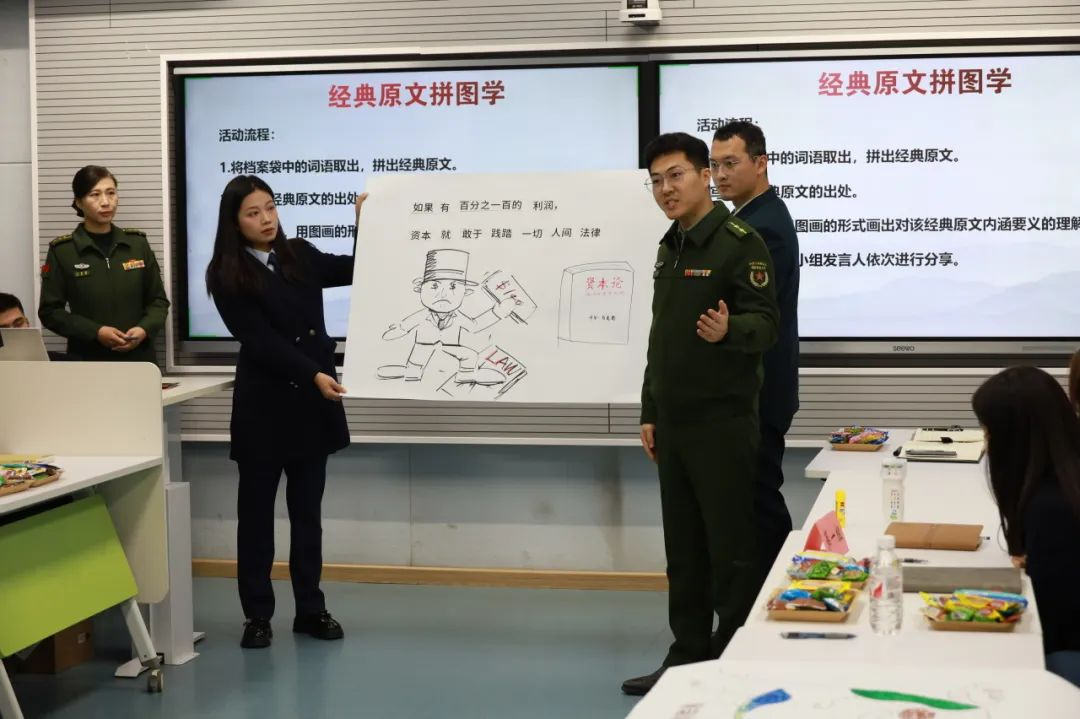活动伊始,主持人设计了一个名为“经典原文拼图学”的暖场环节。学员们分组参与,通过从多块拼图中挑选词语元素,拼组成马克思主义经典著作中的名言金句。随后,各组推选一名代表大声朗读金句,并简要阐释对其内涵的理解与体会。在这个过程中,学员们通过团队合作和同伴互学,不仅重温了经典内容,更在参与式学习中深化了对经典原著内涵的理解,同时激发了大家对理论与现实问题的深入思考。