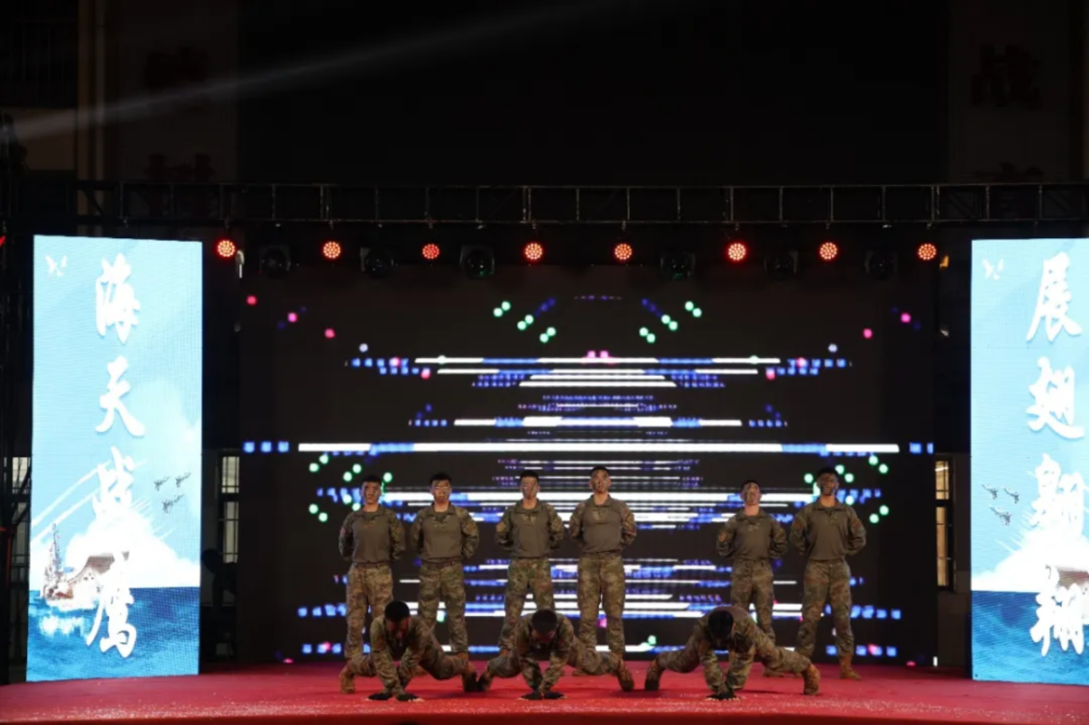 舞蹈《灯火里的中国》用曼妙舞姿礼赞盛世,将万家灯火与军人守护相辉映;《钢铁洪流》再现演训场摸爬滚打场景,彰显军人意志。“双龙街乐队”的歌曲串烧,饱含对军校生活的深情回望。小品《智能训练风波》以诙谐剧情阐明“硬核实力需千锤百炼”的道理,传递“练为战、训为赢”的深刻内涵。全体合唱《假如战争今天爆发》将气氛推向顶点,学员们掷出签满名字与梦想的纸飞机,象征军旅新启航。尾声处,《入海》的深情旋律缓缓流淌。学员们将签满名字与梦想的纸飞机奋力掷向空中,恰似“海天战鹰”展翅翱翔。