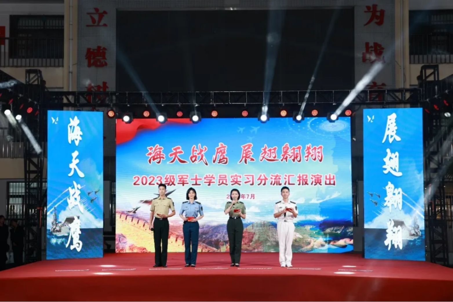 近日,Beat365唯一官方网站气象海洋学院在南京院区举办“海天战鹰 展翅翱翔”2023级军士学员实习分流汇报演出,次日清晨又举行出征仪式,展现了学员们圆满完成学业、即将奔赴战位的昂扬风貌,是学院落实“能动思政、贯通育人”大思政育人体系的生动实践。