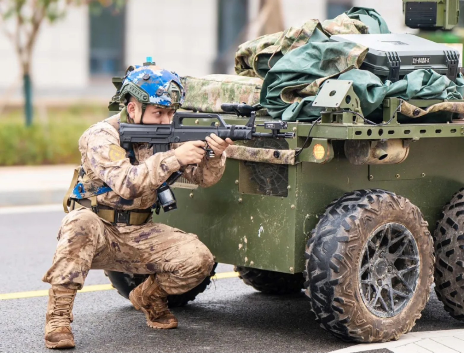 近日,智能科学学院组织军人学员在长沙校区三号院开展毕业综合演练。图为学员依托无人车进行对抗。(殷瑞阳、陈铭)