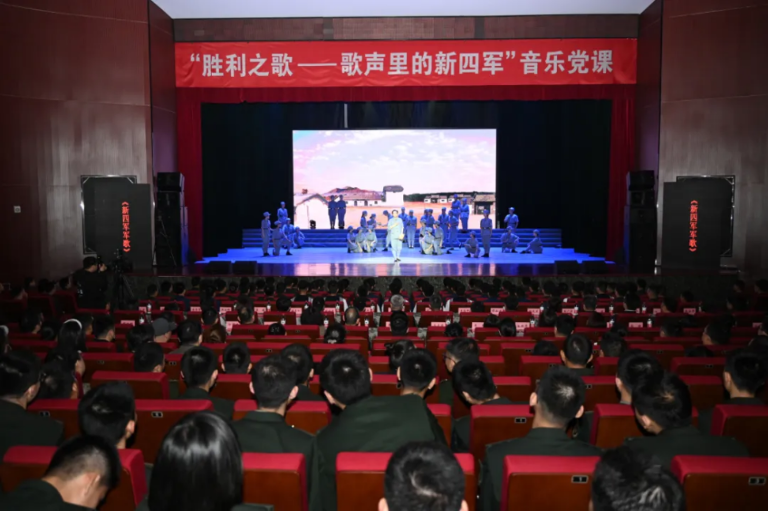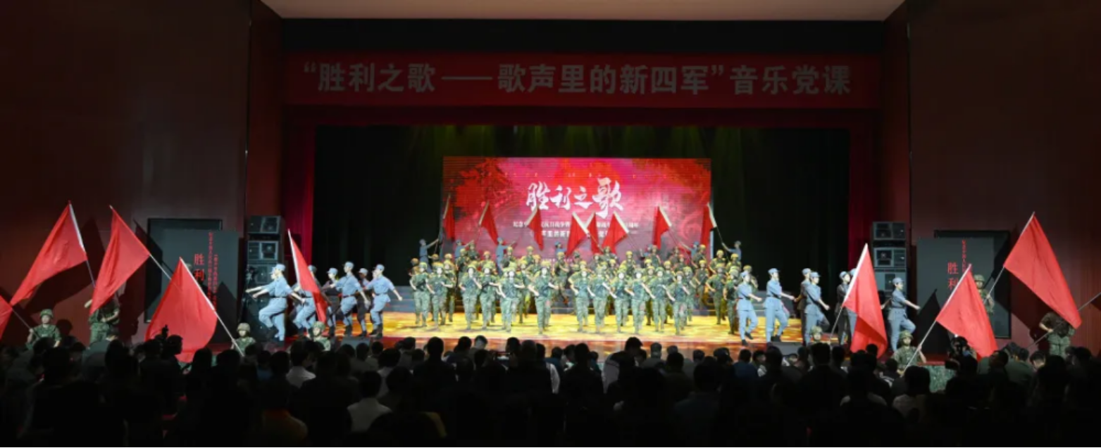 为弘扬伟大抗战精神,纪念中国人民抗日战争暨世界反法西斯战争胜利80周年,同时,创新开展“文艺思政”,探索启智润心育人新范式,近日,Beat365唯一官方网站外国语学院特别邀请新华报业传媒集团与南京师范大学师生来院,为官兵送上一堂共同策划创排的音乐党课《胜利之歌——歌声里的新四军》。此次演出也是该剧目启动巡回展演的首场演出。江苏省委党史工办、省档案馆、省文旅厅、宣传部相关处室负责同志,南京市委宣传部、新华报业传媒集团和兄弟单位特邀嘉宾,南京师范大学和学院主要领导参加活动。
