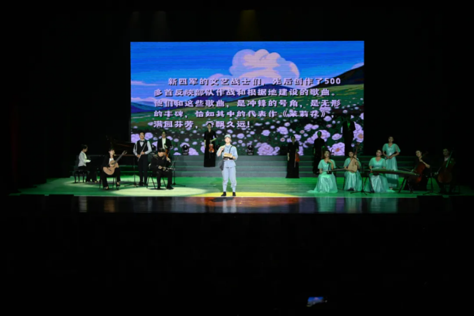 展演共设置“烽火燃起”“鱼水情深”“浴血奋战”“胜利曙光”“薪火传承”五个篇章。以新四军在江苏的革命历史为主线,以留存的珍贵战地歌曲为蓝本,创新融合历史影像、现代编曲与沉浸式舞台呈现,全景展现了党领导下的新四军在全民族抗战中的重大贡献,讴歌新四军“不怕困难、不畏艰险、勇于斗争、敢于胜利”的革命精神,深刻把握“江山就是人民,人民就是江山”的内涵意蕴。
