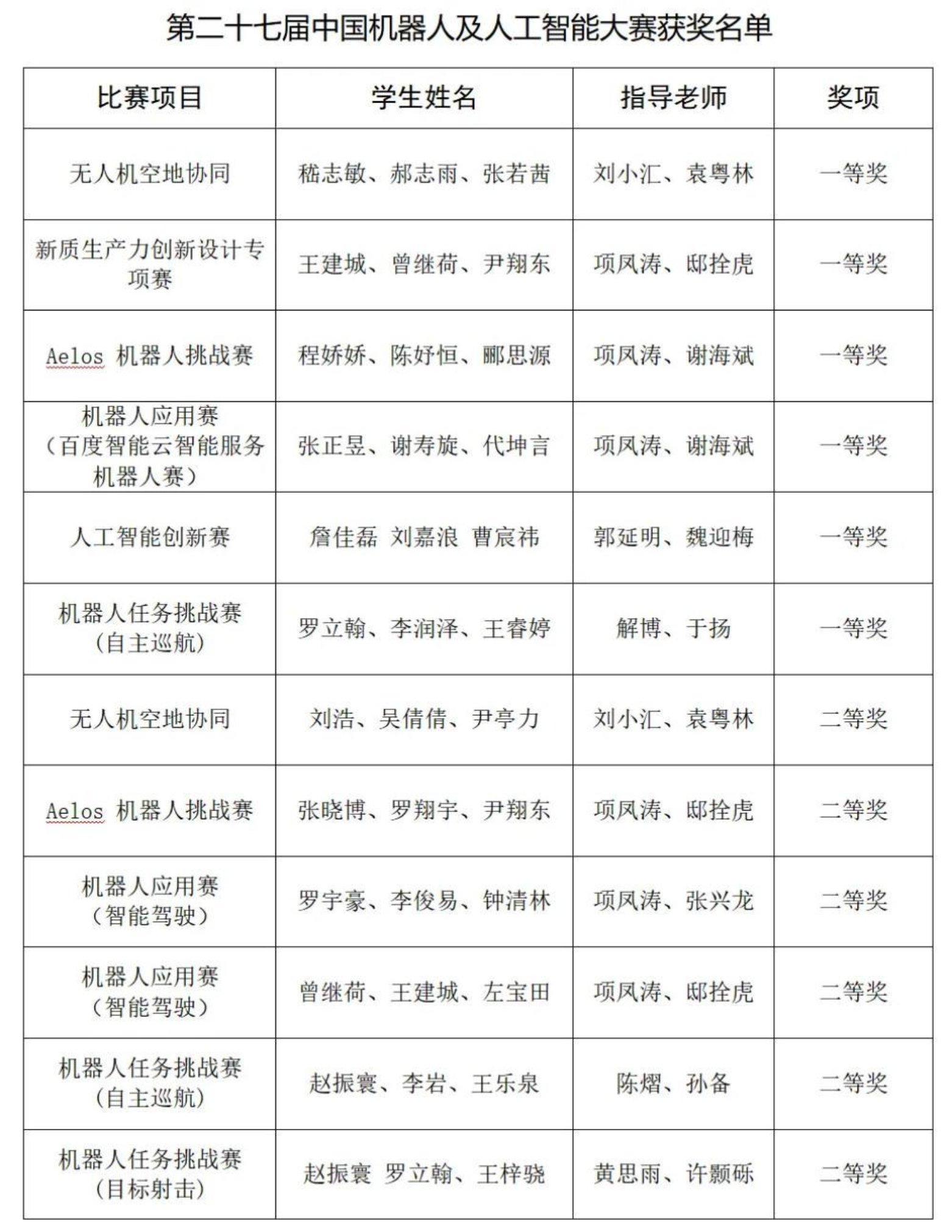 近日,第二十七届中国机器人及人工智能大赛多项赛事全国总决赛在苏州、合肥陆续举办。作为国内最具影响力的机器人及人工智能赛事之一,本次大赛吸引了来自全国各地1200余支顶尖高校队伍,围绕机器人、无人机协同、数字孪生、智能制造等多个前沿赛项展开角逐。我校理学院、电子科学学院、智能科学学院、电子对抗学院、系统工程学院、空天科学学院16支队伍在无人机空地协同、百度智能云智能服务机器人赛项、自主巡航、目标射击等赛项中表现优异,共获全国一等奖6项、二等奖6项、三等奖4项。