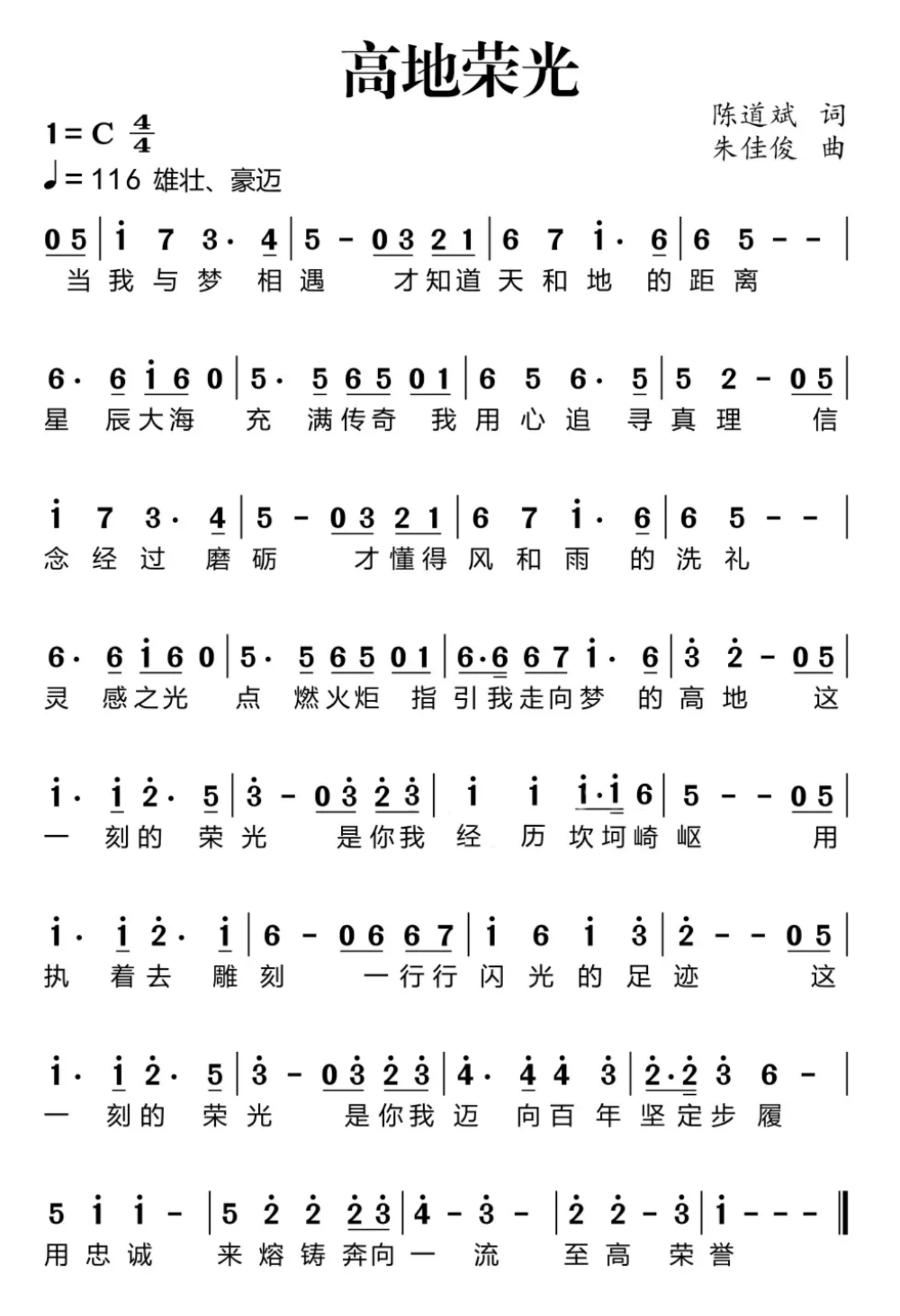 “高地荣光——致敬最美科大人”颁奖典礼主题曲《高地荣光》是一首充满激情与力量的大合唱歌曲。歌词描绘了追逐梦想过程中的坚韧与荣耀,激励着大家怀揣信念与忠诚,勇攀高峰,向着至高荣誉不懈奋进,具有强烈的感染力和鼓舞人心的力量。歌曲速度选取队列行进速度每分钟116拍,采用了进行曲通常的四二拍,适合行进演唱。歌曲编配方面以经典管弦乐配器为基础,在间奏以后融合进了更时尚的电声乐及摇滚元素,充分展现了传统与科技的结合。