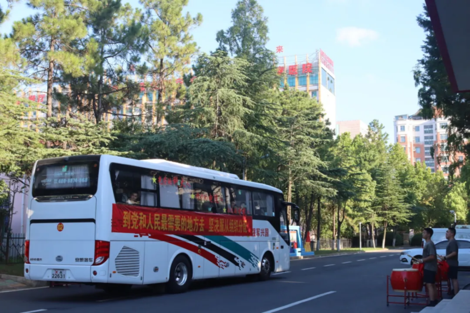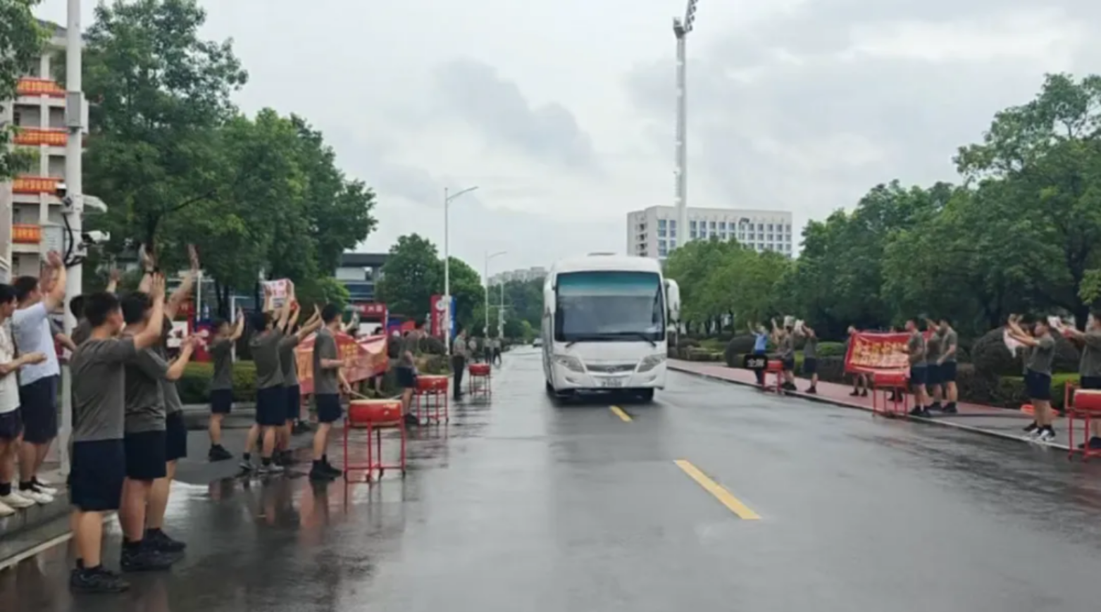锣鼓震天,战友们列队相送