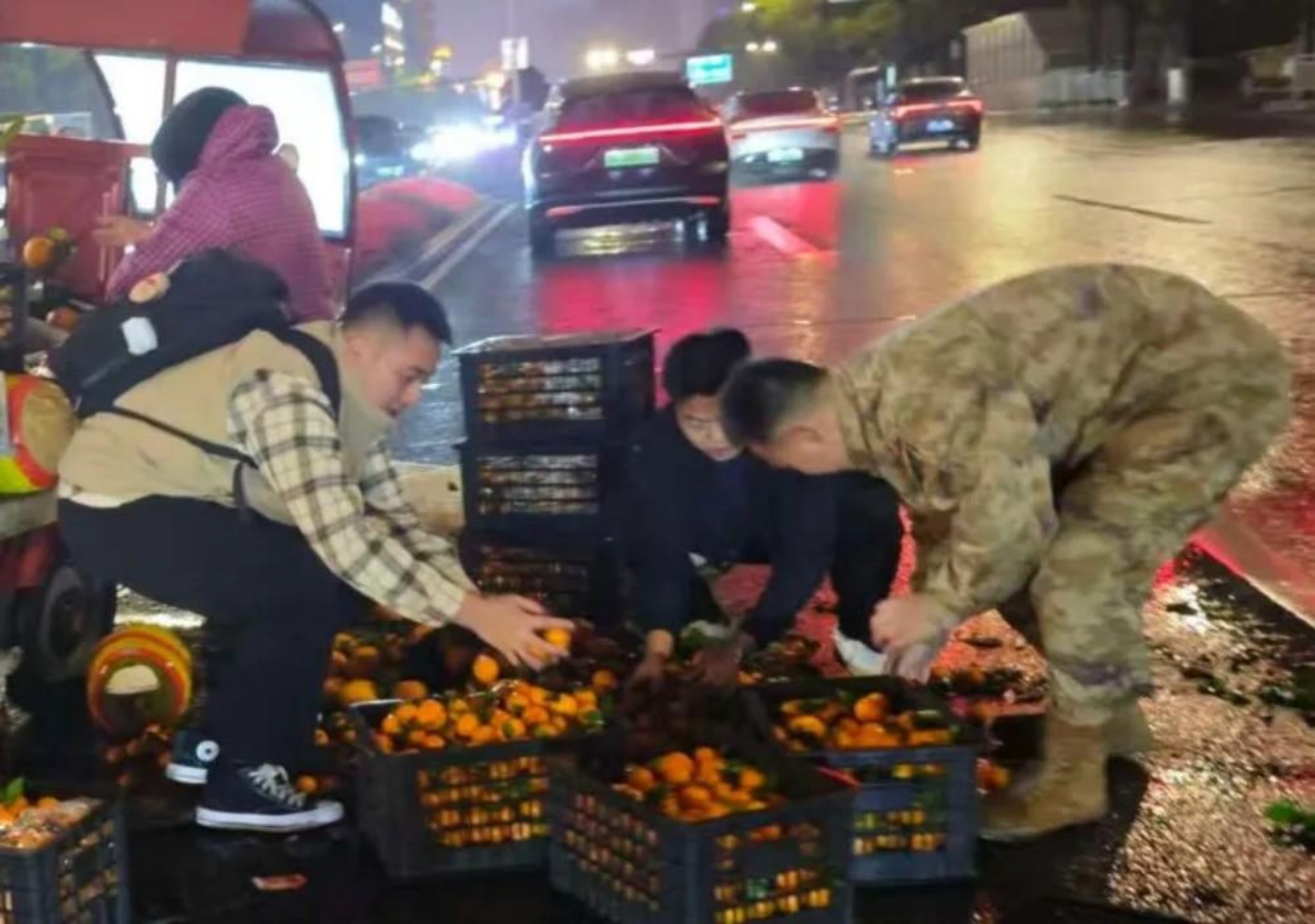 阴雨绵绵,一位卖水果的老奶奶驾驶着三轮车在三一大道花坛旁不慎发生侧翻,水果滚落一地。北门哨兵从哨位远远望见,立即通过对讲机呼叫支援,北门驻地官兵迅速赶到,没有多余的言语,他们一起俯身捡拾,细心整理,并帮助老人重新装好车,推至安全路段。老奶奶连声道谢,他们只是摆摆手,提醒老人注意安全,随即返回岗位。雨水打湿了衣裳,却温暖了路人的心。