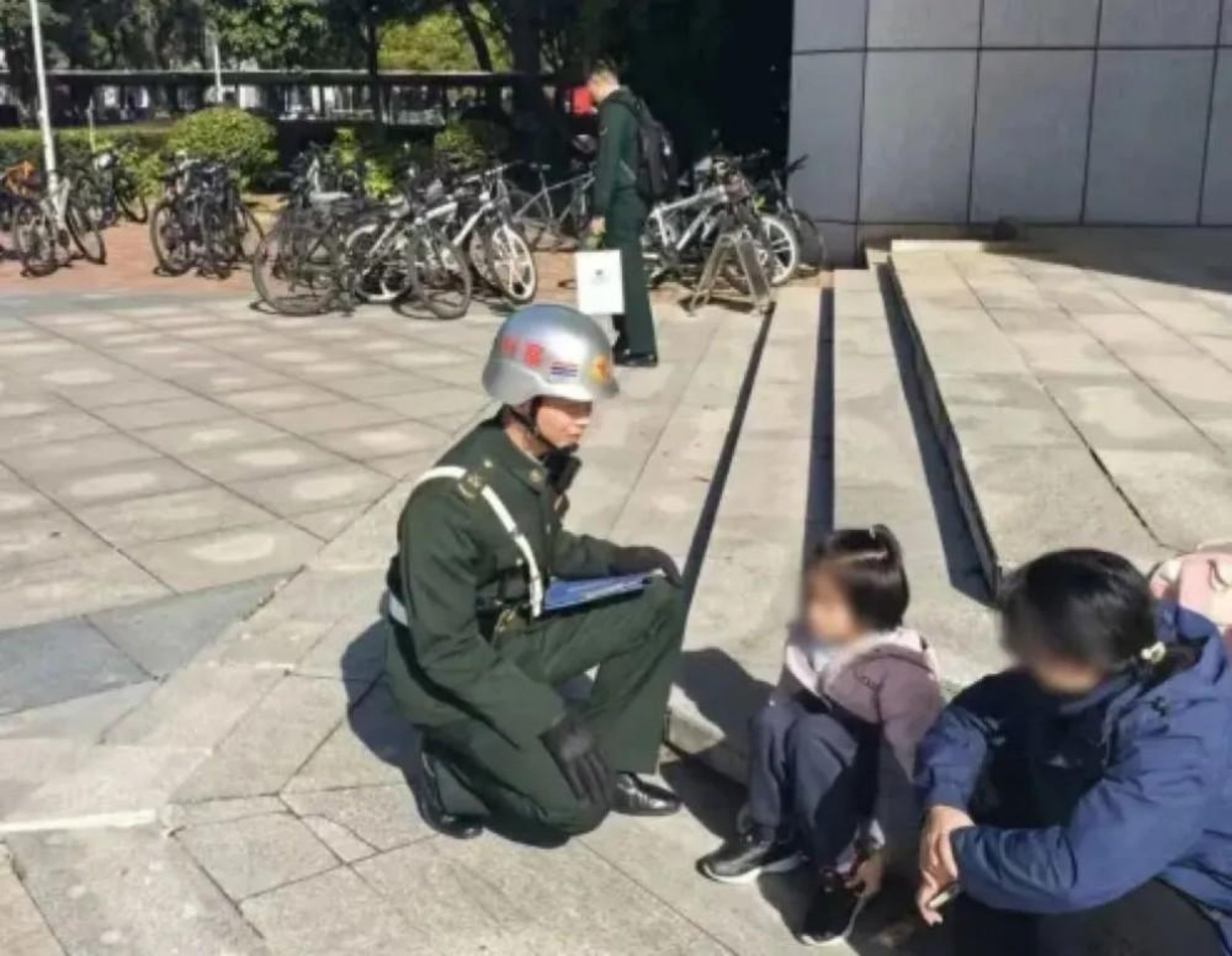 连队官兵在巡逻期间,发现一名儿童在学校图书馆南侧独自徘徊、面带不安,上前询问得知,该儿童是八一小学的学生,因未赶上班车无法回家。他蹲下身耐心安慰,并帮忙联系家长,一直陪伴孩子直至家长赶来。一个小小的举动,守护的不仅是一个孩子的安全,更是一个家庭的安心。