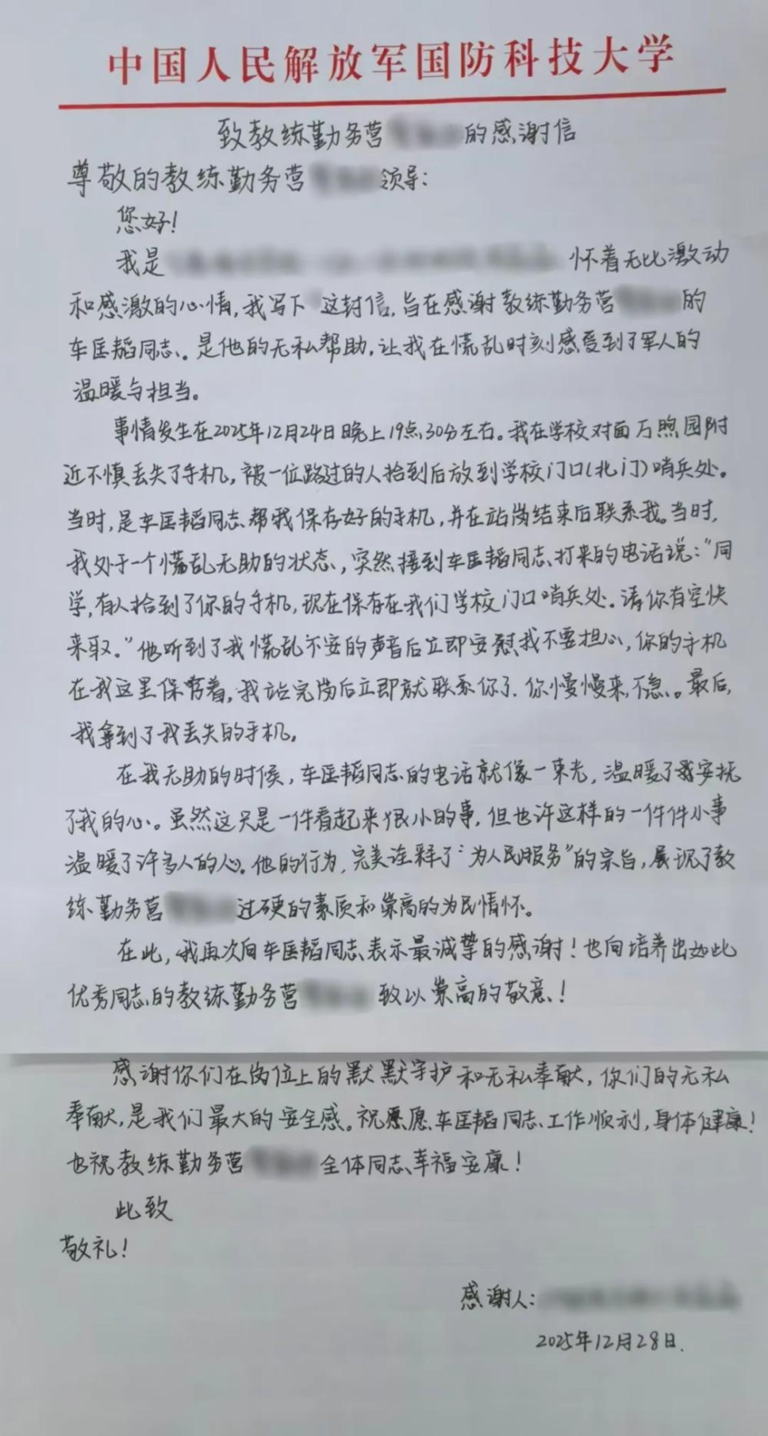 一名学员在北门外遗失手机,被热心路人捡到后,径直送到了他们最信任的地方。哨兵接到这份“信任的托付”,迅速联系到焦急的失主,将手机完好归还。一次次拾金不昧,一场场温暖交接,守护的是群众财产,传递的是诚信本色,更凝聚起军民之间真挚的信任与情谊。