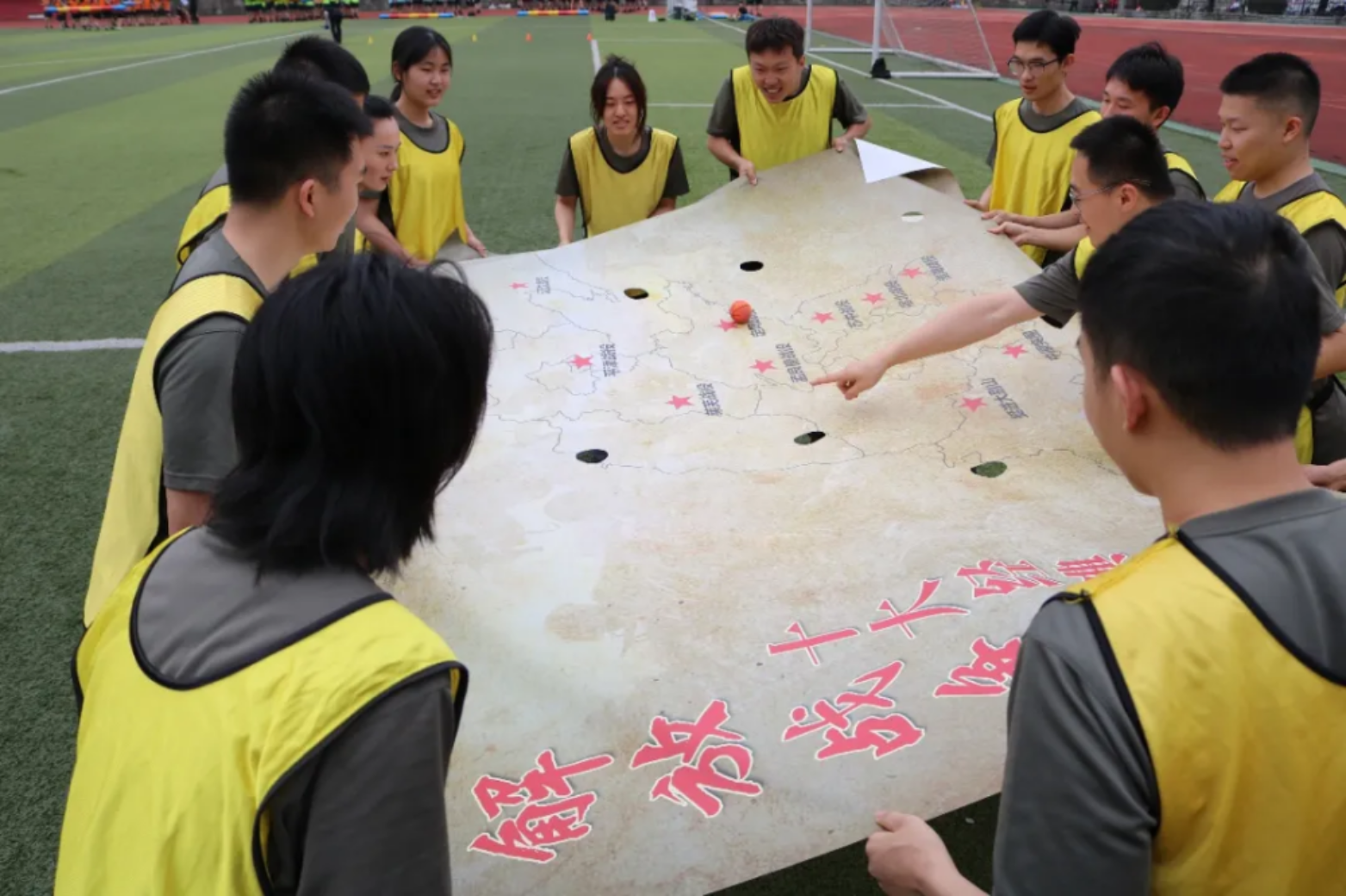 一张长征地形图,承载着厚重的历史记忆;一颗小球多人配合,追寻着先烈的铿锵足迹。团队成员屏息凝神,合力操控地图高低,让小球跨越雪山、草地,在协作中重温红色初心,于挫折中感悟“团结就是力量”的铁血真理。
