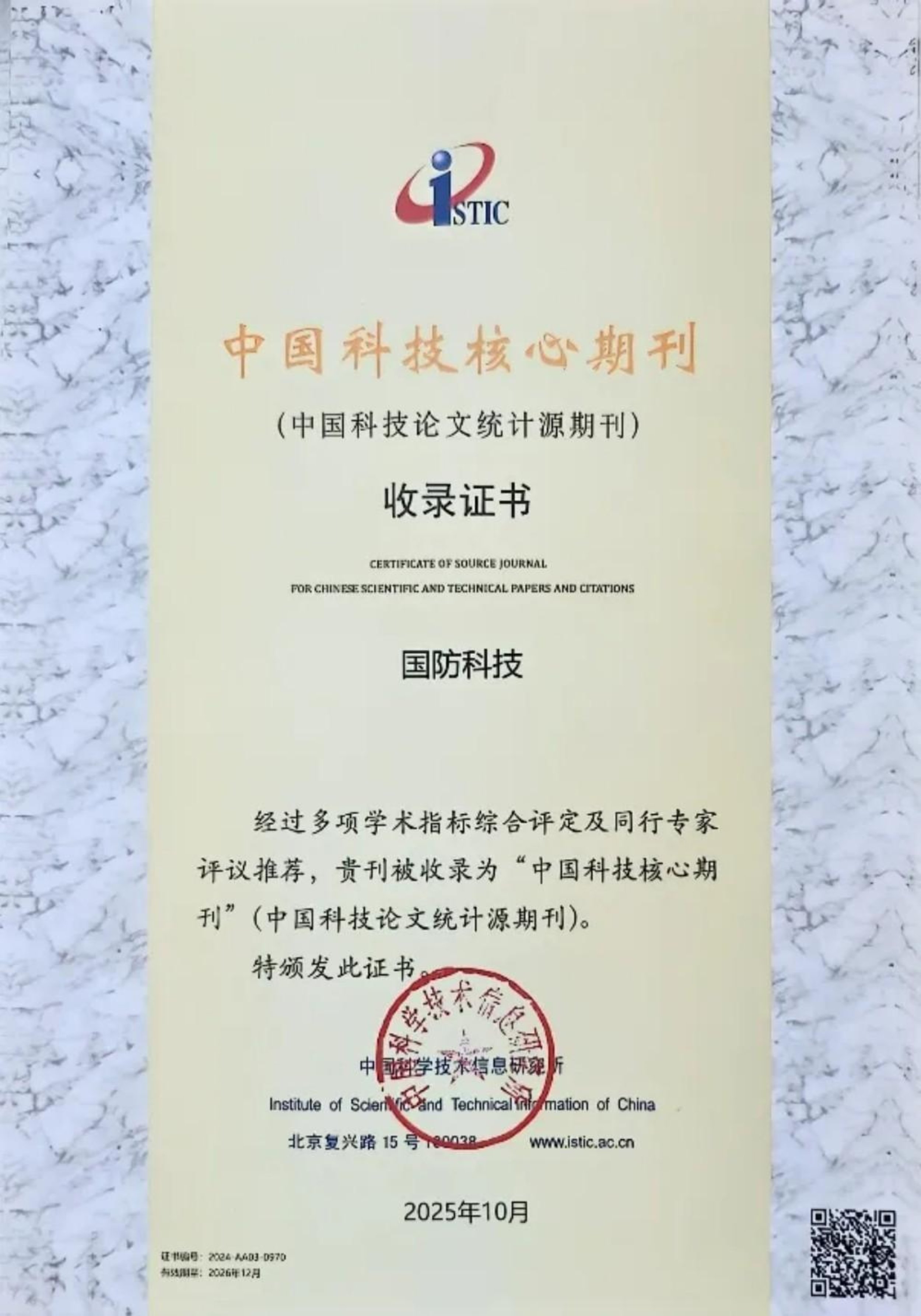 近日,2025年中国科技论文统计结果发布会暨中国一流科技论文世界影响力评价论坛在京举行。会上,中国科学技术信息研究所发布了《2025年版中国科技期刊引证报告(核心版)》等系列年度报告,由学校主管、办公室主办的《国防科技》期刊,凭借其不断提升的学术质量与影响力,再次成功入选“中国科技核心期刊”(中国科技论文统计源期刊)。