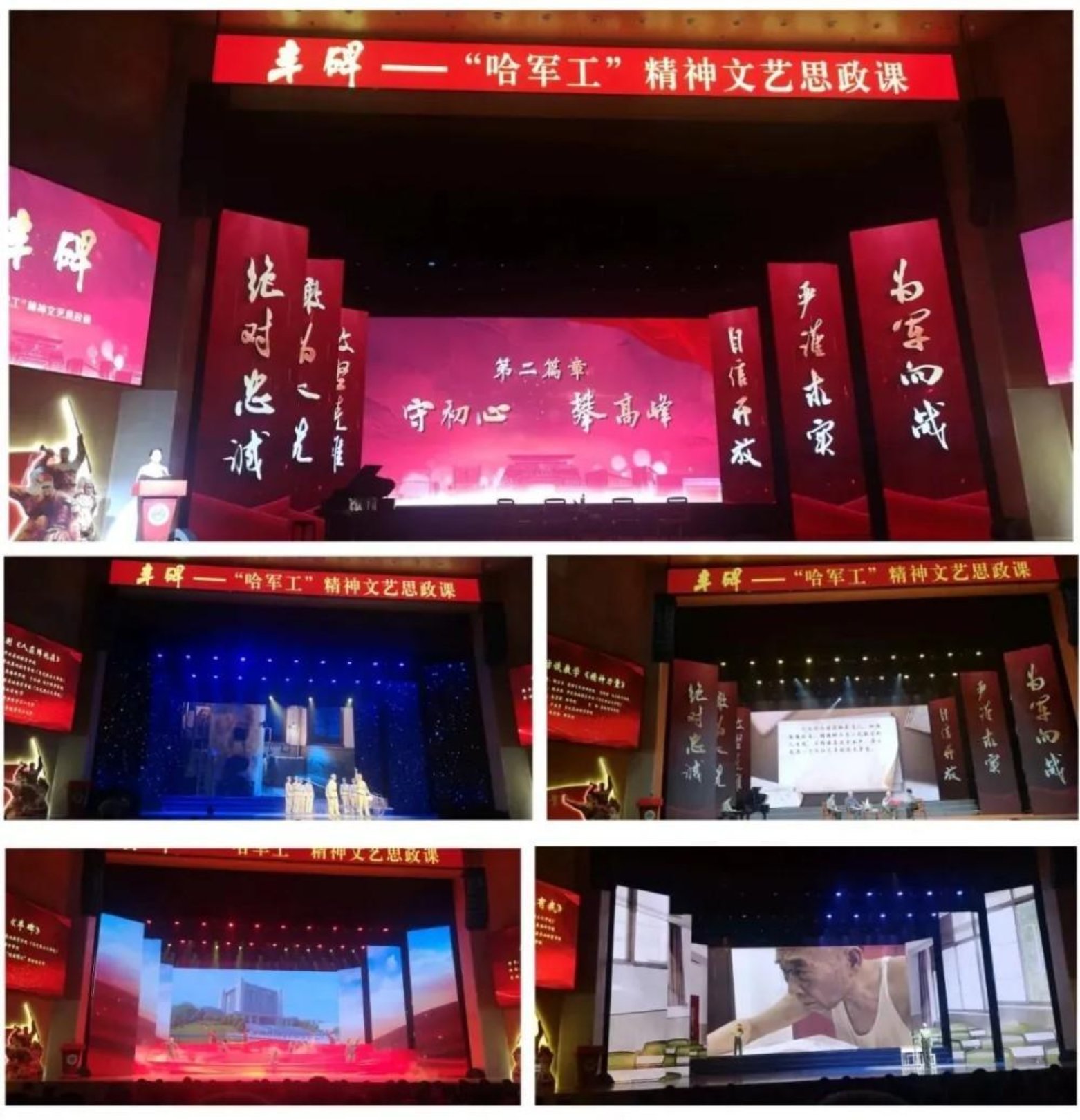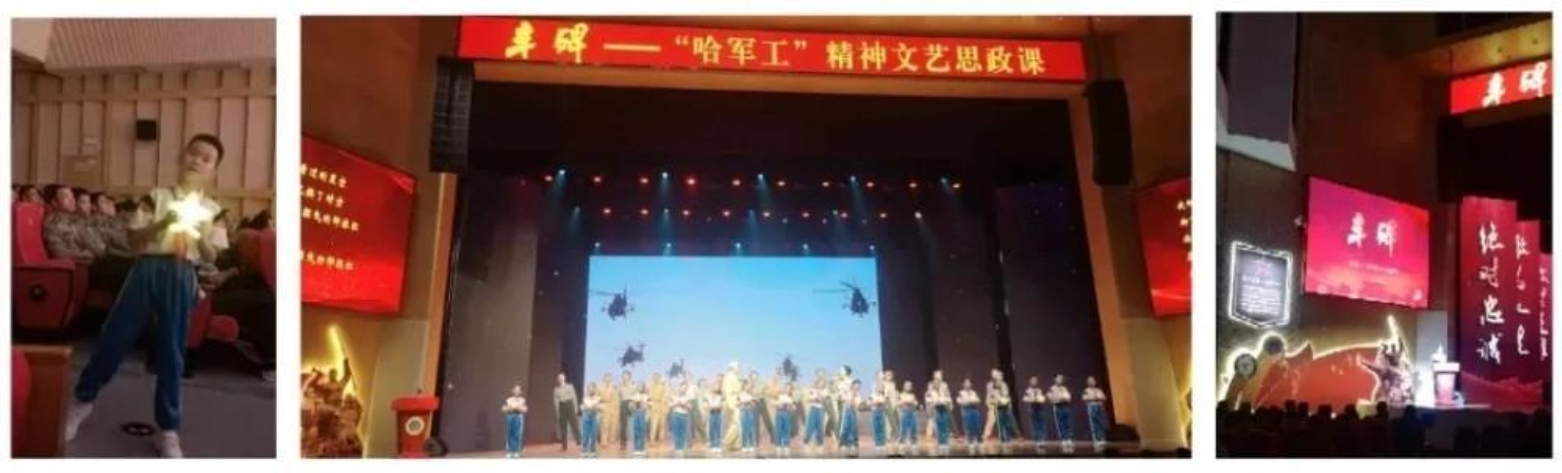 晚上七点半,一场别开生面的演出准时上演——“丰碑——‘哈军工’精神文艺思政课”。这是一场关于“初心”的穿越剧。有解说、有歌舞、有短剧、有现场采访,是一场情景交融的“思政大课”。