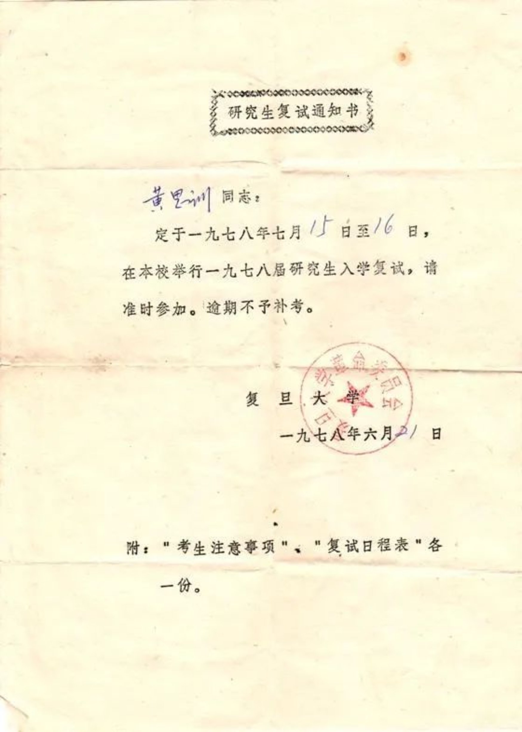 黄思训报考研究生复试通知书