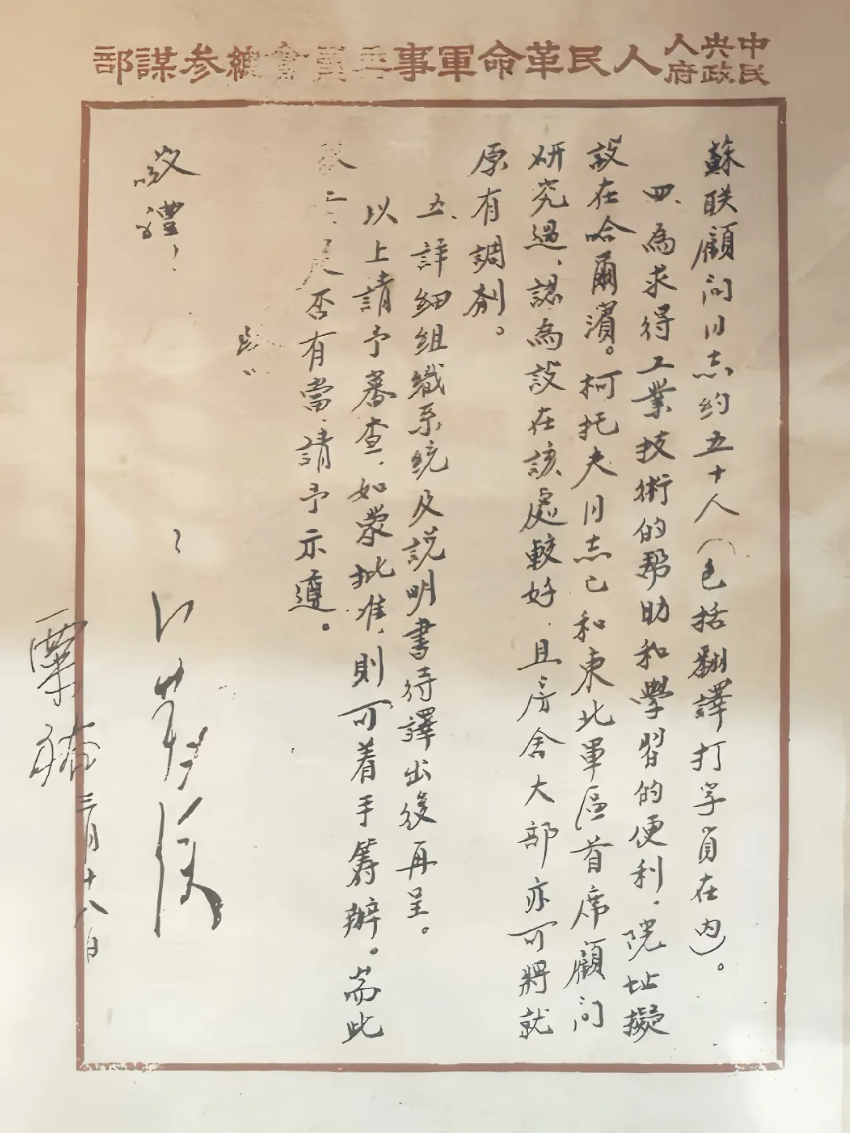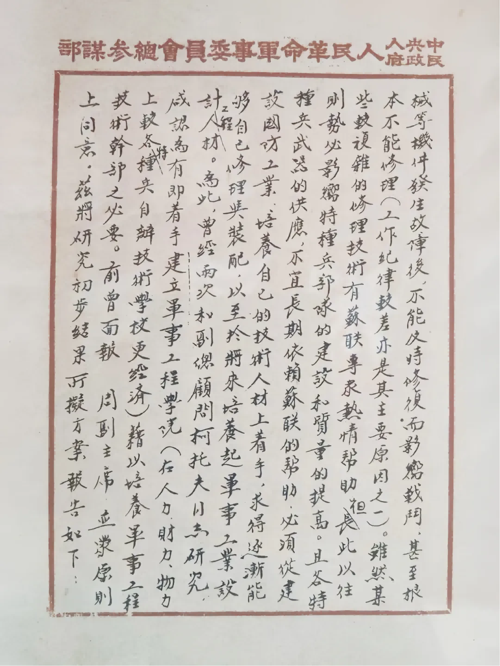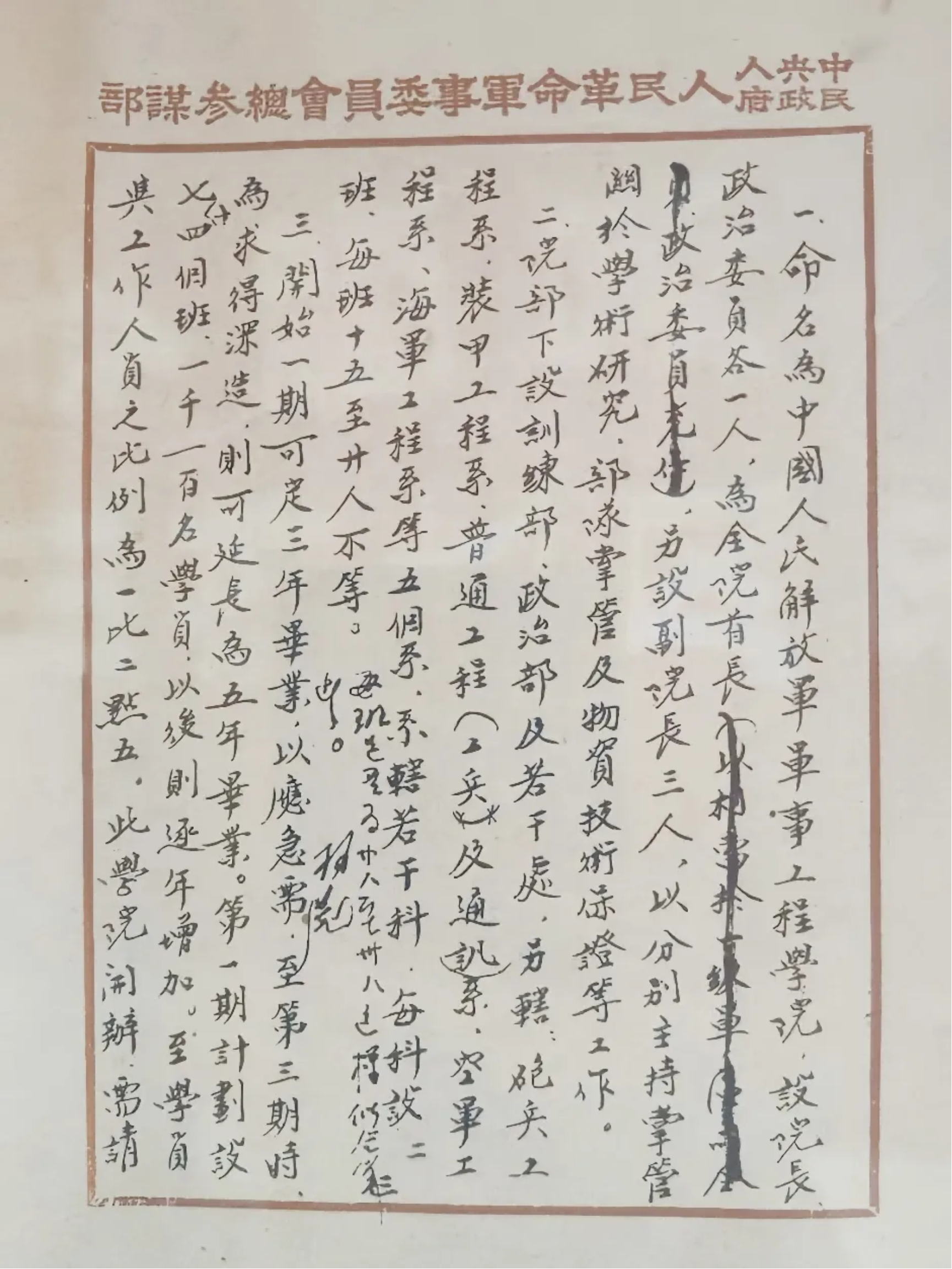 在中国人民解放军军事工程学院(简称哈军工)创建的重要档案史料中,由代总参谋长聂荣臻和副总参谋长粟裕上报中共中央和中央军委的《关于成立军事工程学院的报告》无疑是重要档案之一。这份报告对哈军工成立的必要性、迫切性作了详细的阐述:“我军各特种部队发展甚快,成绩亦大。其装备正日益增加和复杂。唯在技术上面远落后于部队的发展和不能满足部队的要求”“且各特种兵武器的供应,不宜长期依赖苏联的帮助,必须从建设国防工业、培养自己的技术人才上着手,求得逐渐能够自己修理与装配,以至于将来培养起军事工业设计工程人才。”同时报告明确了学院的名称,院领导的设置,各部、系的组成,学制长短变化,聘请苏联专家以及选址规划等相关内容。