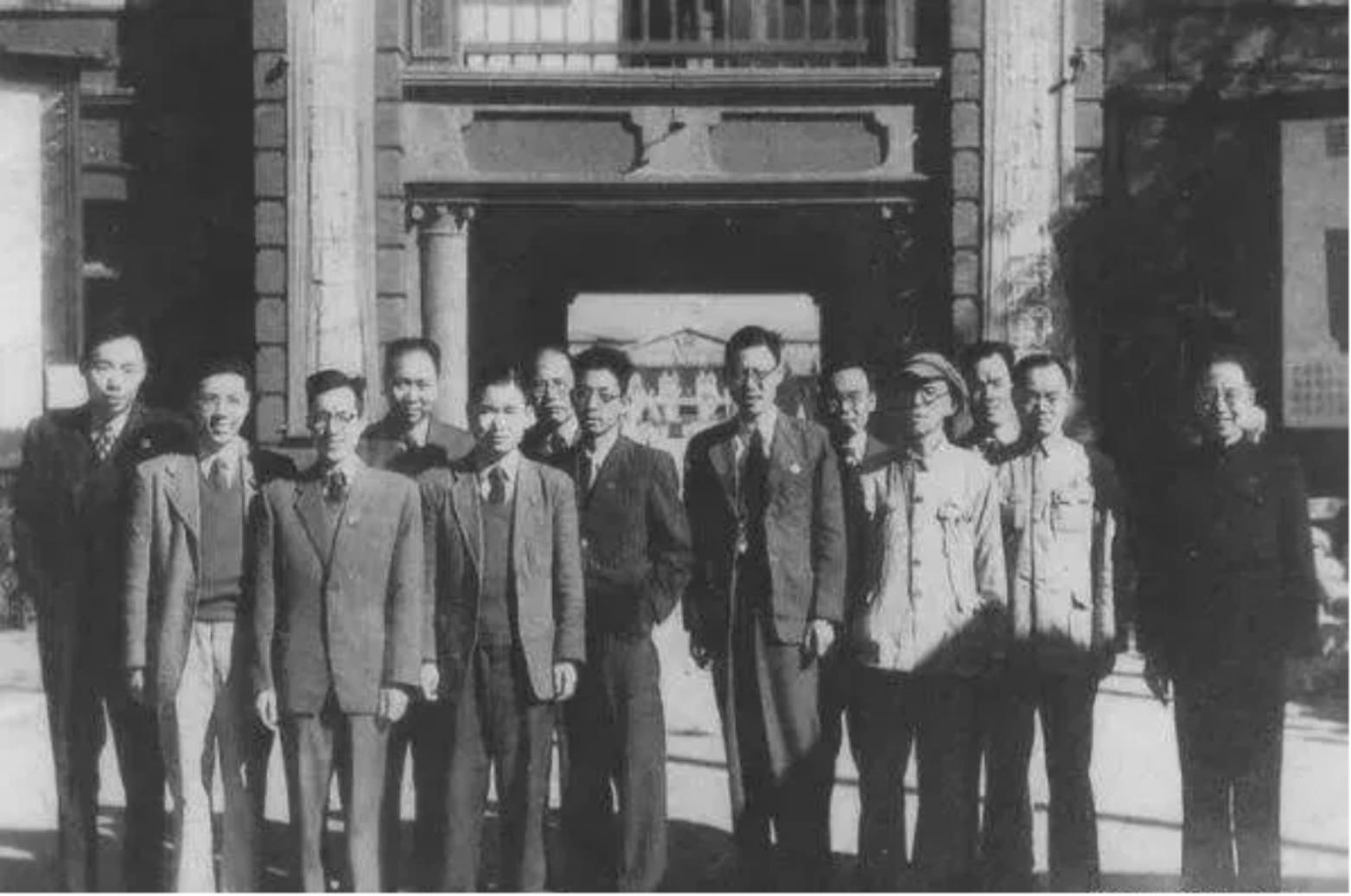 1949年9月,军事科学研究室成立。13位专家教授合影,左起:沈正功、周祖同、马明德、何乃民、钟以文、张述祖、金家骏、鲍廷钰、任新民、江潮西、岳劼毅、赵子立、张绿康。
