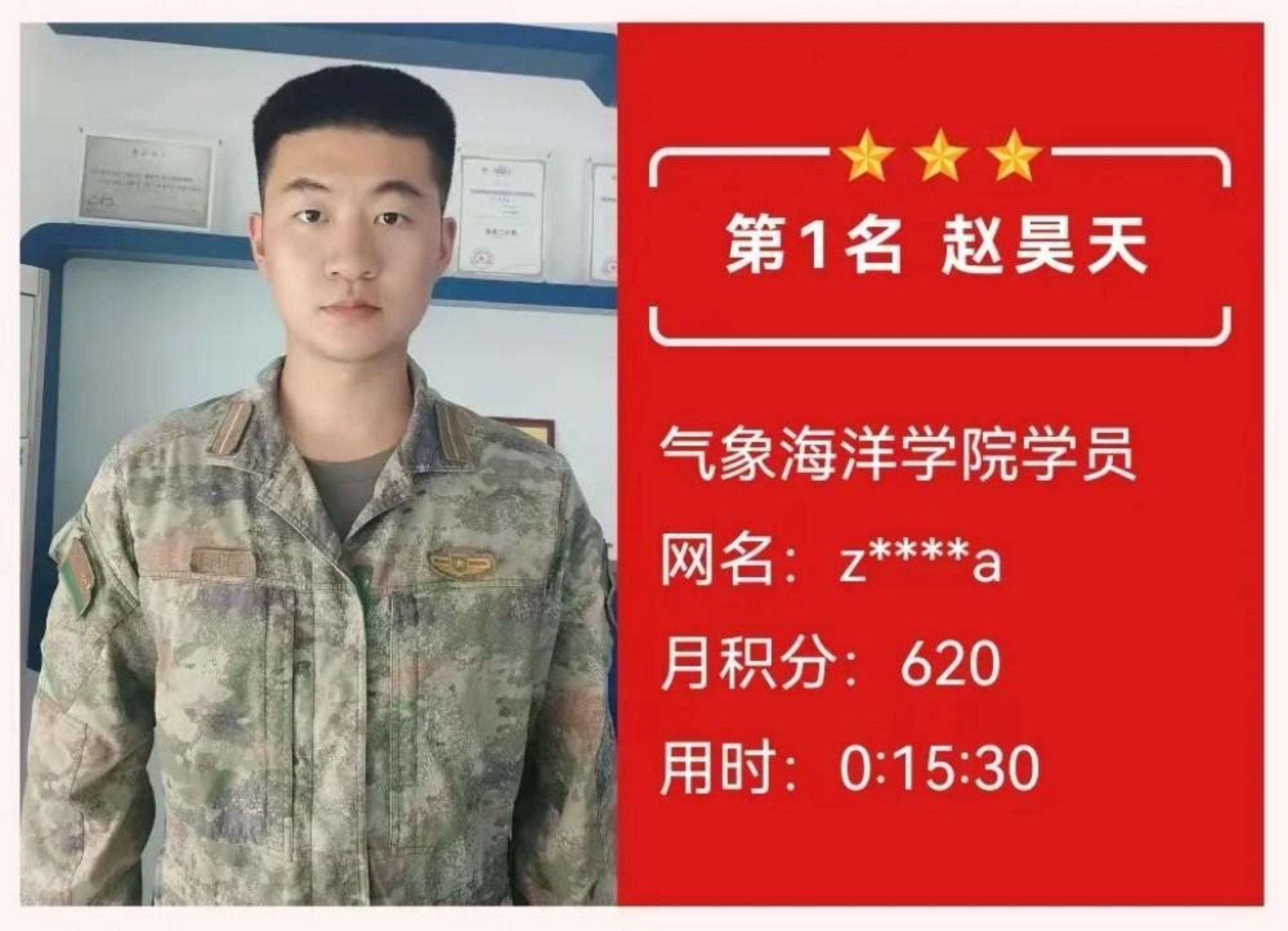 获奖感言:学道须当猛烈,始终确守初心。在理论答题的层层闯关中,我深切体会到知识如何沉淀为内心的力量。每月的积累不仅是智慧的叠加,更是意志的锤炼。那些与知识相伴的深夜,那些反复推敲的瞬间,都在默默锻造着军校学员应有的沉稳与坚韧,这份荣誉属于每个共同奋斗的日夜。未来我将继续厚积薄发,让理论之光照亮前行之路,在强军征程中锤炼使命担当。