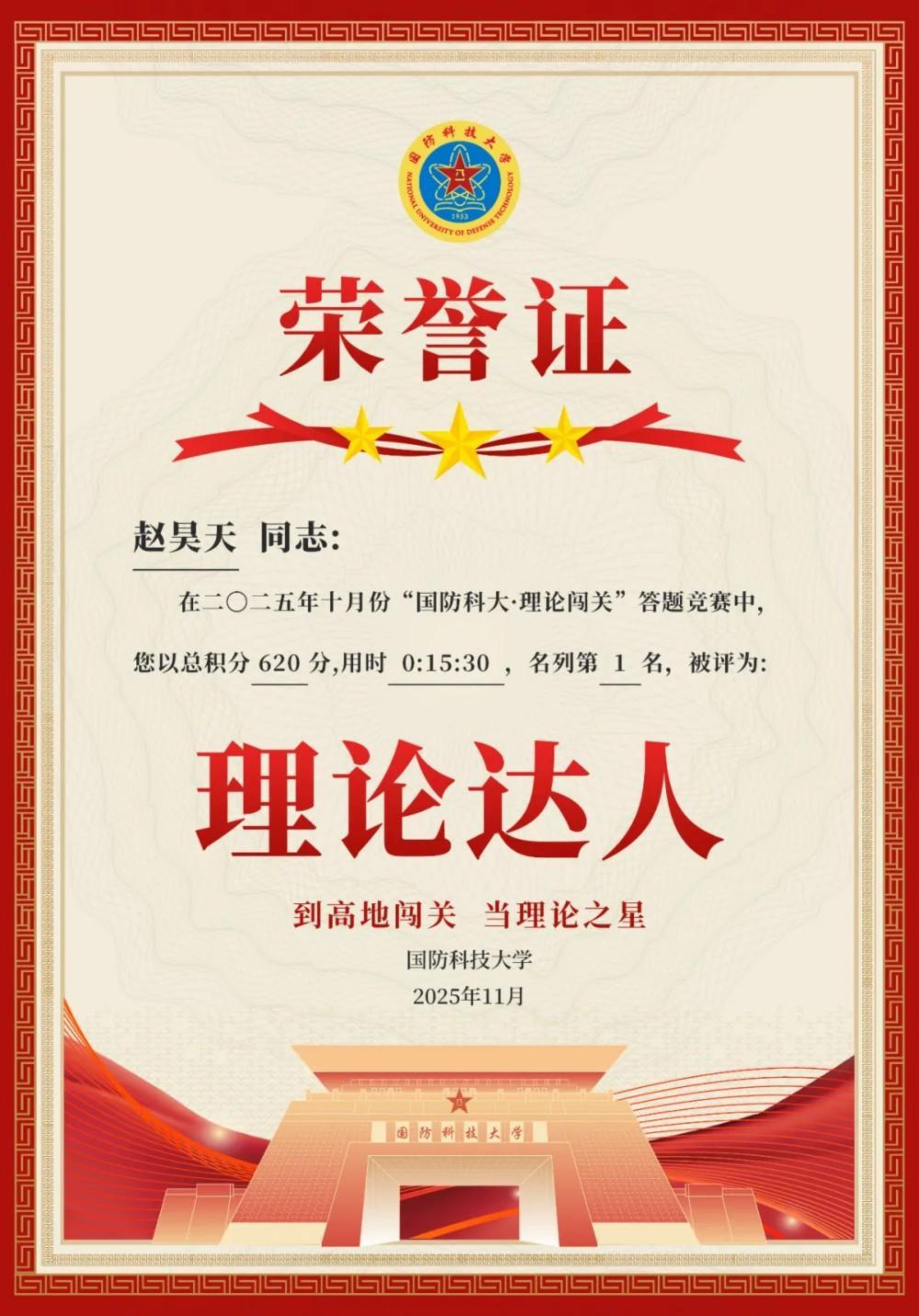 获奖感言:每一秒闯关,都是穿越思想迷雾,锚定真理坐标的旅程;每一次闯关,都如科研攻关时滴水不漏的严谨;每一天闯关,都是纯粹思维的洗礼,也是指导实践的钥匙;每一月闯关后荣获理论达人,既是照亮一月努力的勋章,也是吹响战场打赢的号角。理论闯关胜利者,誓作科研至尖兵,必做战场打赢人。