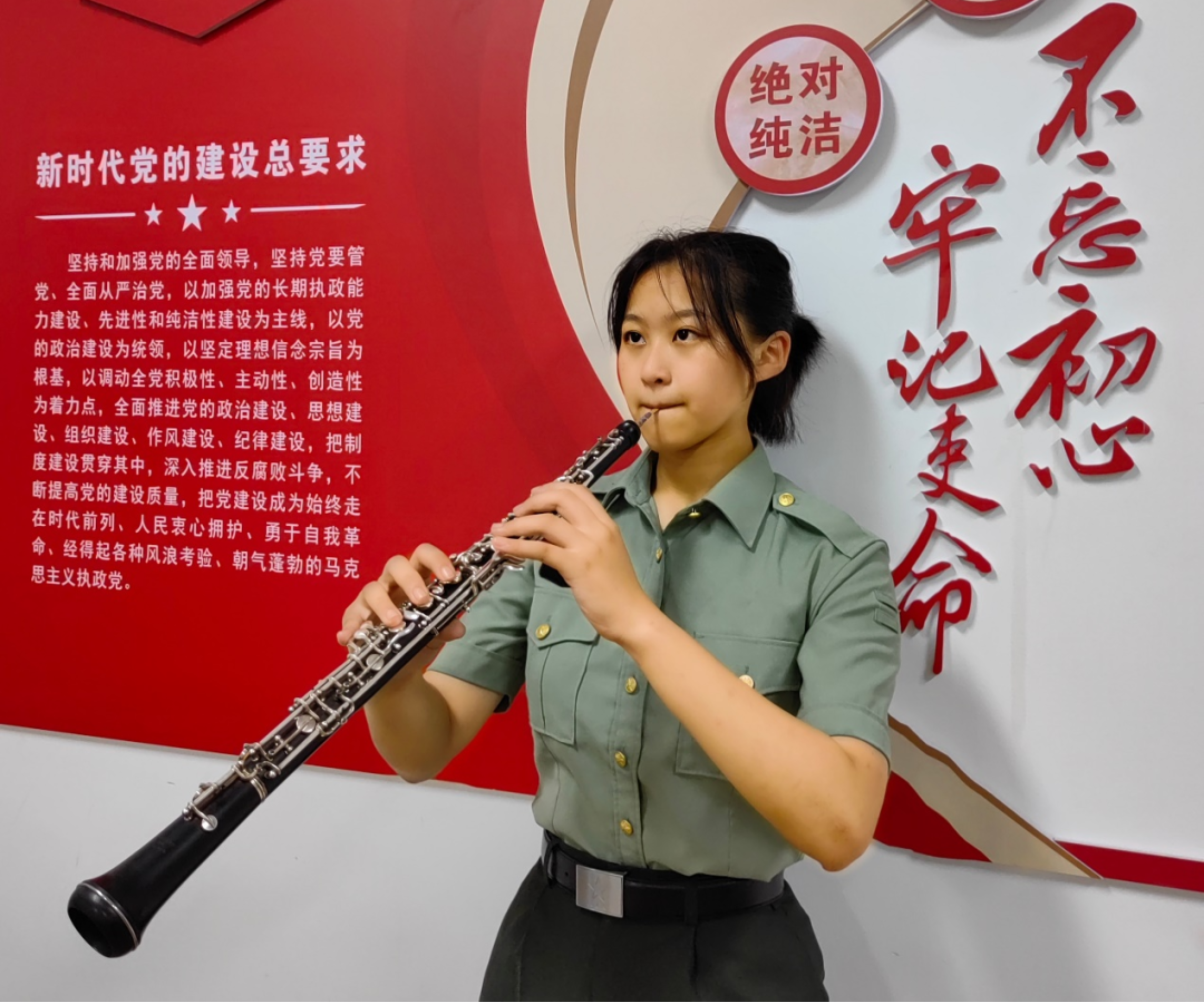 王睿思从小学习乐器,已达到双簧管九级水平。新训期间,她加入了军乐团,并随团参加建校70周年专题晚会。彩排固然辛苦,但是强烈的荣誉感和责任心支撑她一路向前,最终圆满完成任务。