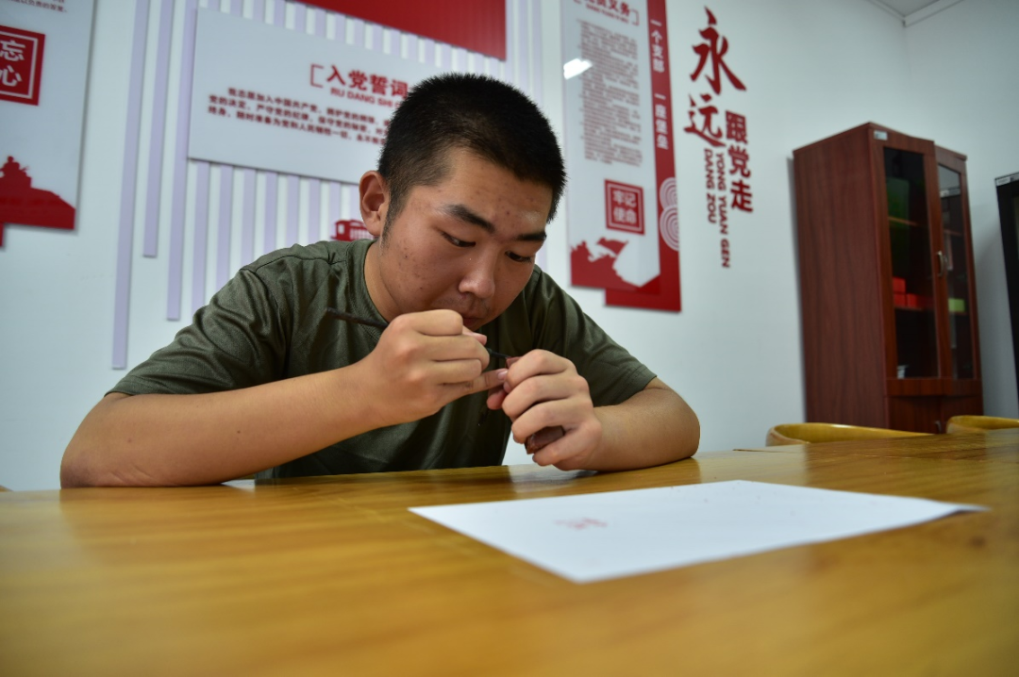 曾听过:“以刀为笔,以茧为墨。”不同于墨汁落于纸上的轻柔悠然,“方寸之间见真章”的篆刻更让常斯博钟情。从容易的阴刻到富有挑战的阳刻,从单调的平面到高难度的镂空,他逐渐理解了玉汝于成的含义。篆刻早已不只是一门技艺,更是态度,是精神。