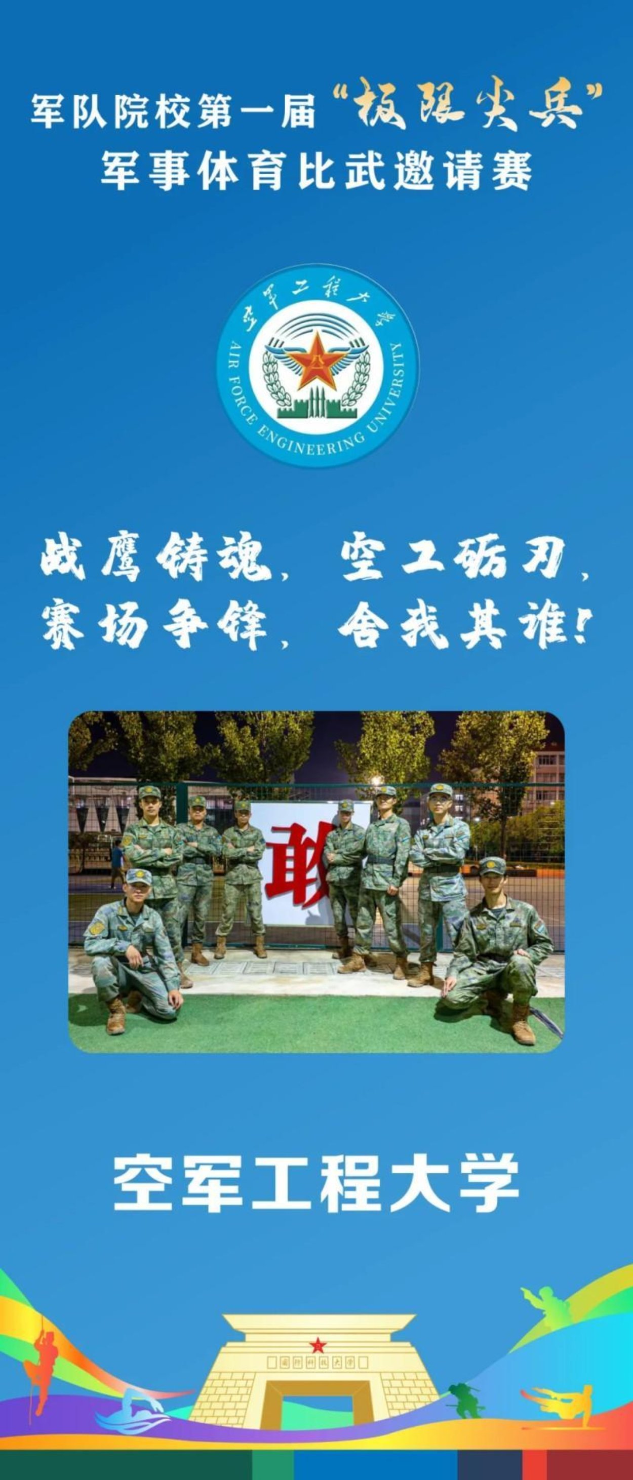 “战鹰铸魂” 锚定育人初心,忠诚担当筑牢信仰根基;“空工砺刃” 锤炼过硬本领,深耕实战锻造胜战尖兵!空军工程大学的学员以鹰击长空的锐气,在比武场上彰显属于空天尖兵的壮志与豪情!