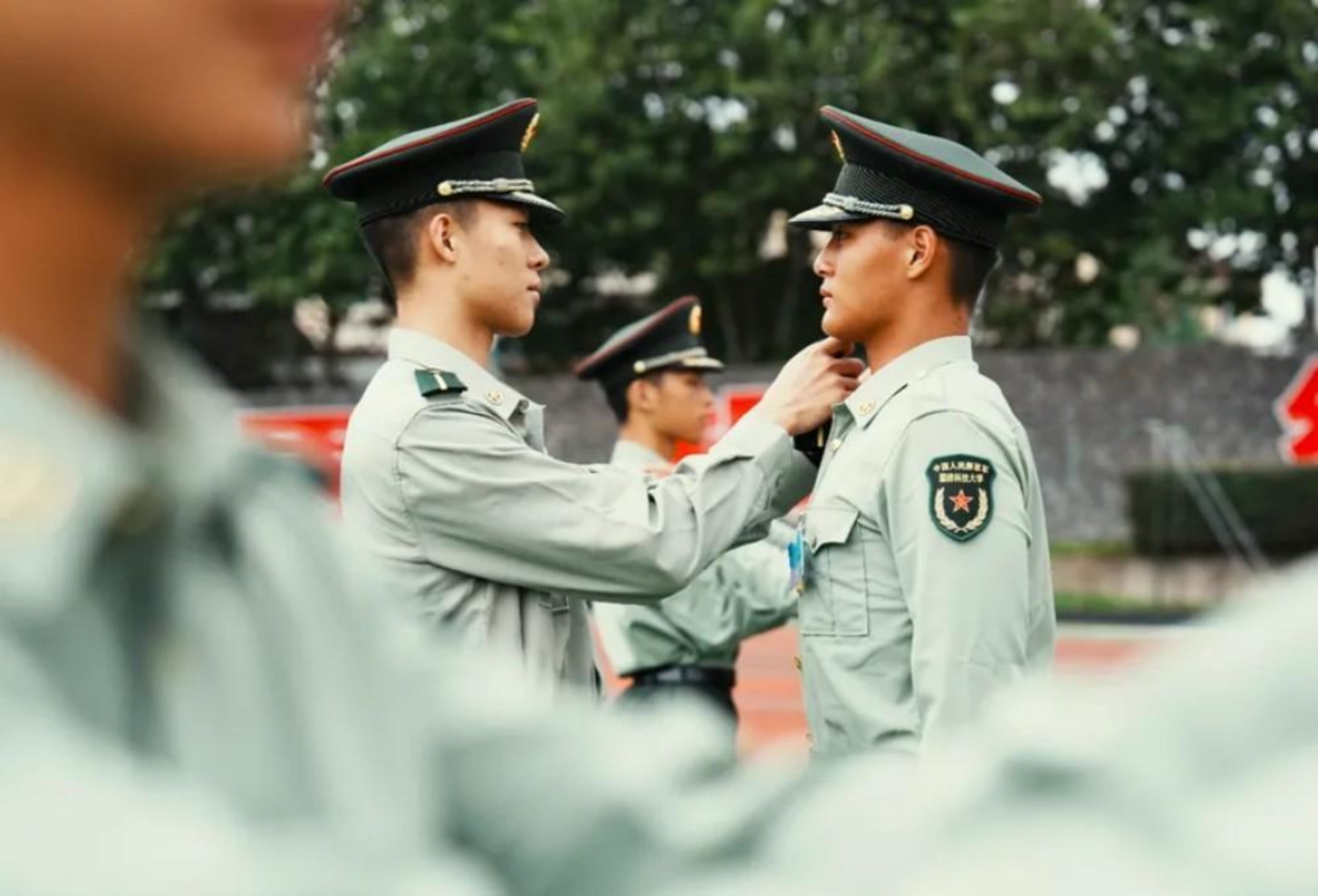 秋日的科大校园,军徽闪耀,气氛庄重。在外国语学院2025级新学员授衔仪式上,有这样一幅特殊画面:哥哥张哲源作为高年级学员,亲手为他刚刚入学的双胞胎弟弟张哲畅佩戴上象征军人身份的肩章。尽管一年前在未来道路选择上历经波折,未能同哥哥一起圆梦科大,但弟弟仍初心不改,锚定哥哥的足迹,一往无前。