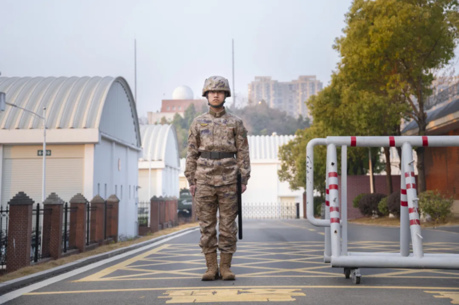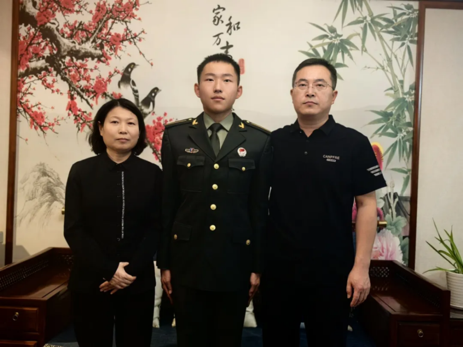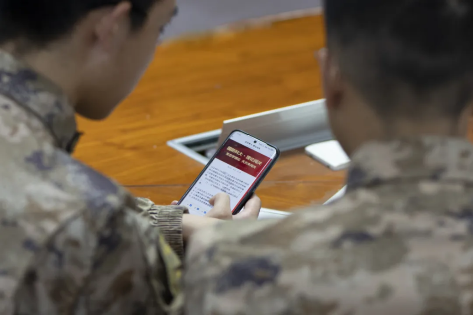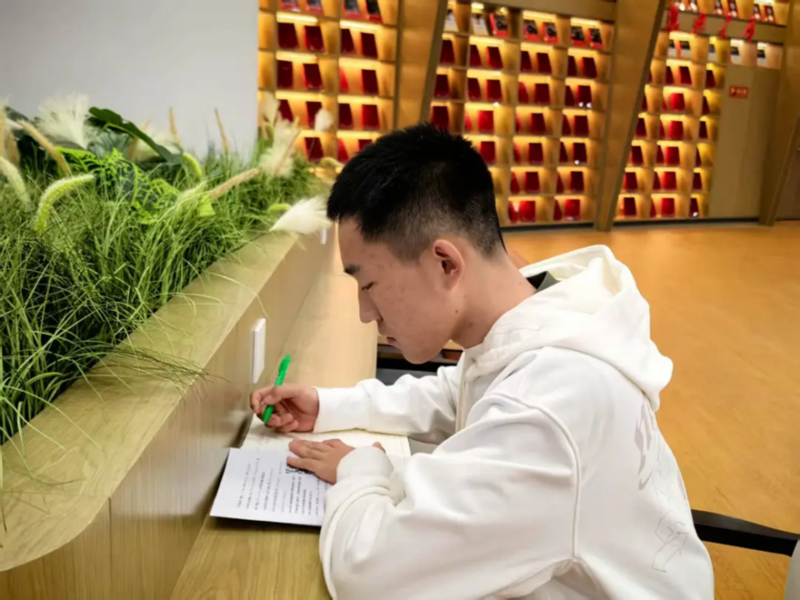 学校图书馆内,军装笔挺