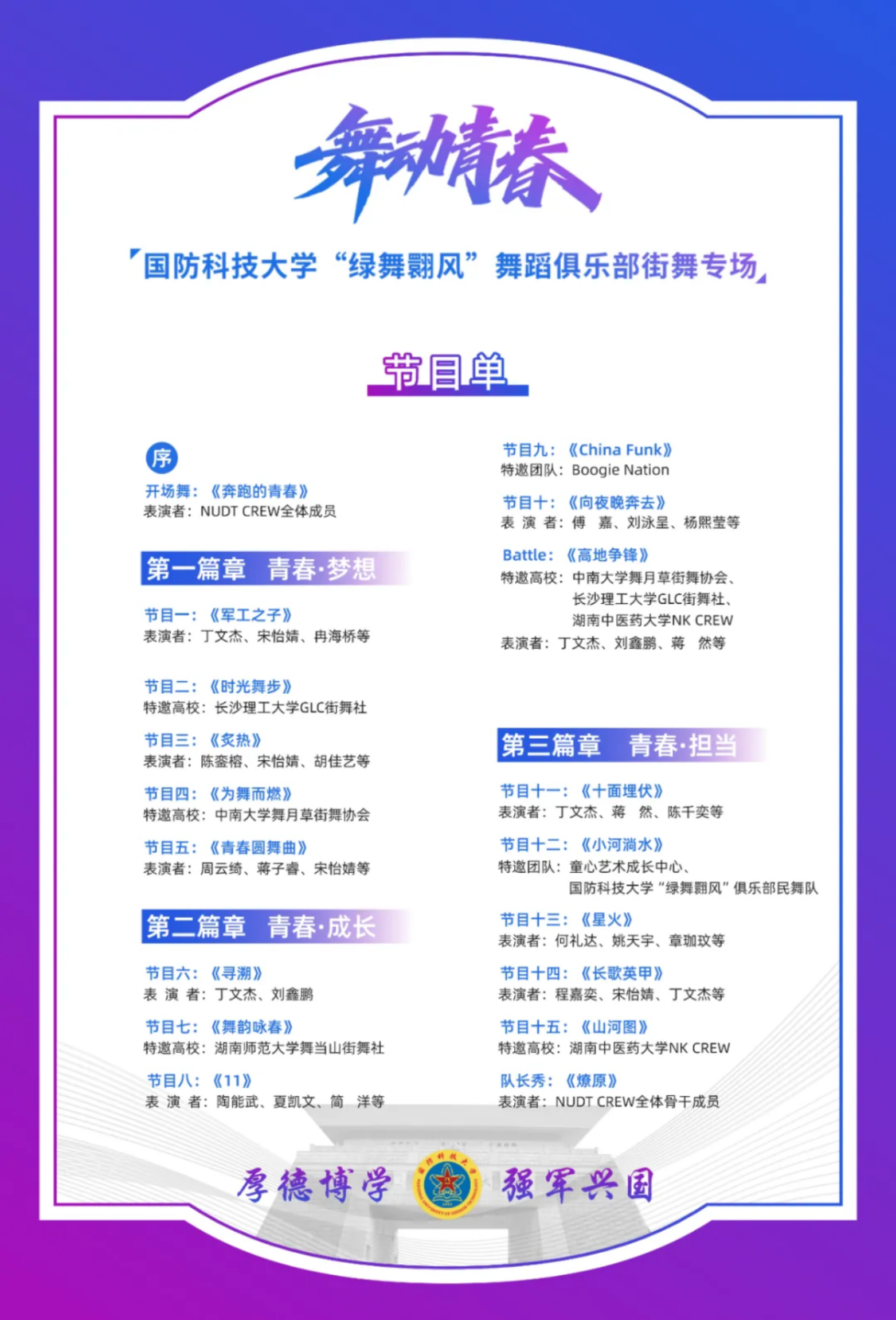 NUDT CREW自组建以来,一直秉持着丰富校园文化生活、培养和发挥学员特长的宗旨,刻苦训练、认真排练,顺利完成了建校70周年专题晚会、年度颁奖晚会、草地音乐节等多项演出任务,于2025年组织筹备首届街舞专场。为学校热爱街舞的学员提供了一个培养爱好、张扬个性、提升自我的平台。