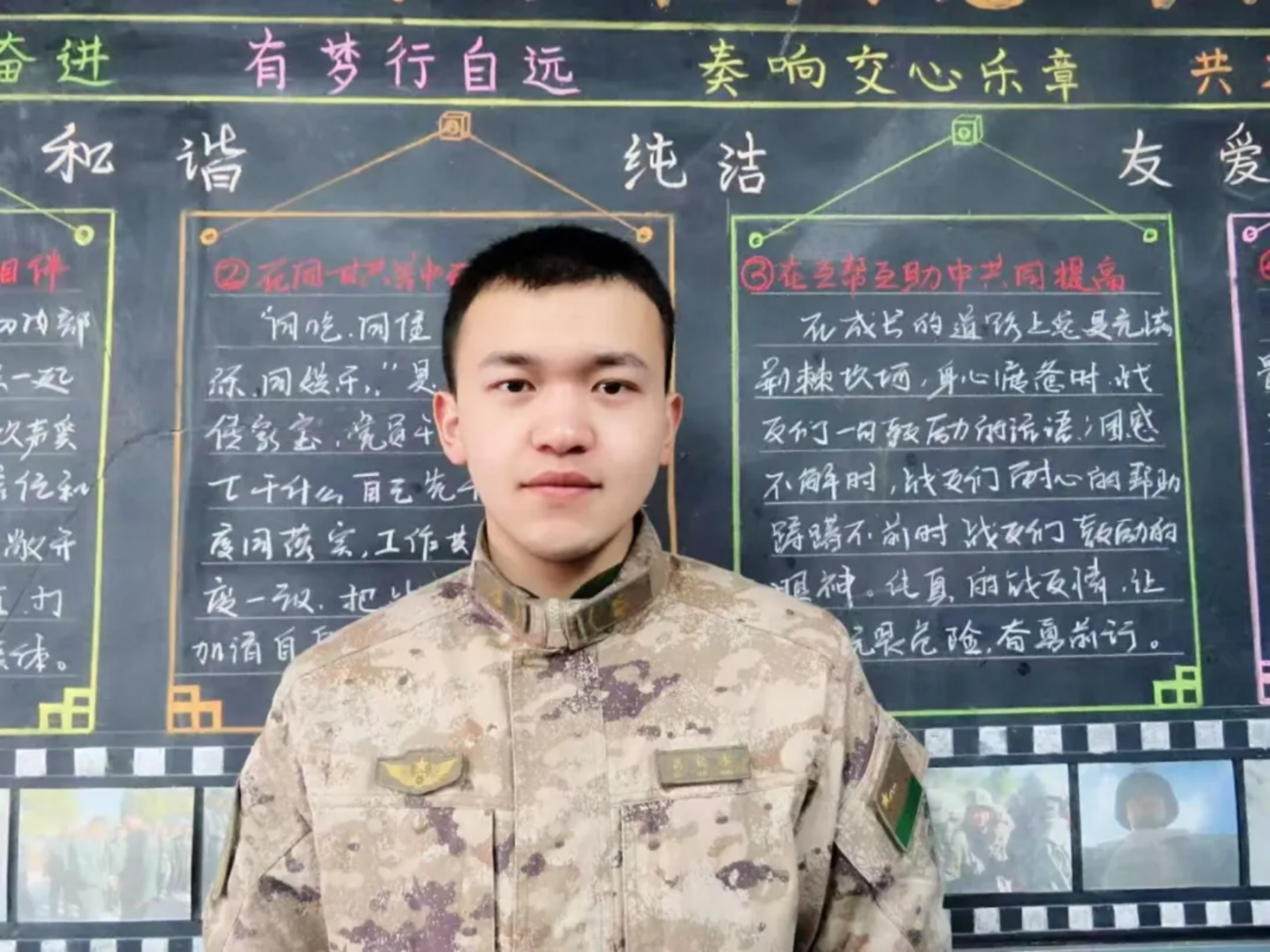 我来自新疆喀什,2023年3月入伍,曾在新训时因表现优秀被表彰为优秀新兵,后服役于陆军新疆某部。2023 年8月,随部前往海拔5000米高原执行任务。缺氧不缺精神,海拔高斗志更高。同年12月因工作突出获“四有”优秀士兵并记嘉奖一次,2024年6月参加全军统考,以726分、新疆陆军男兵第一的成绩考入国防科大。