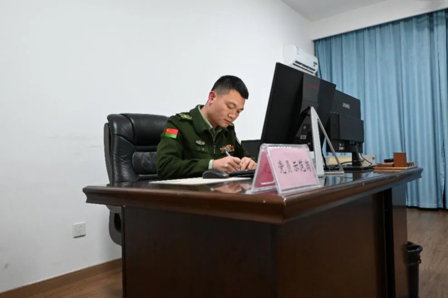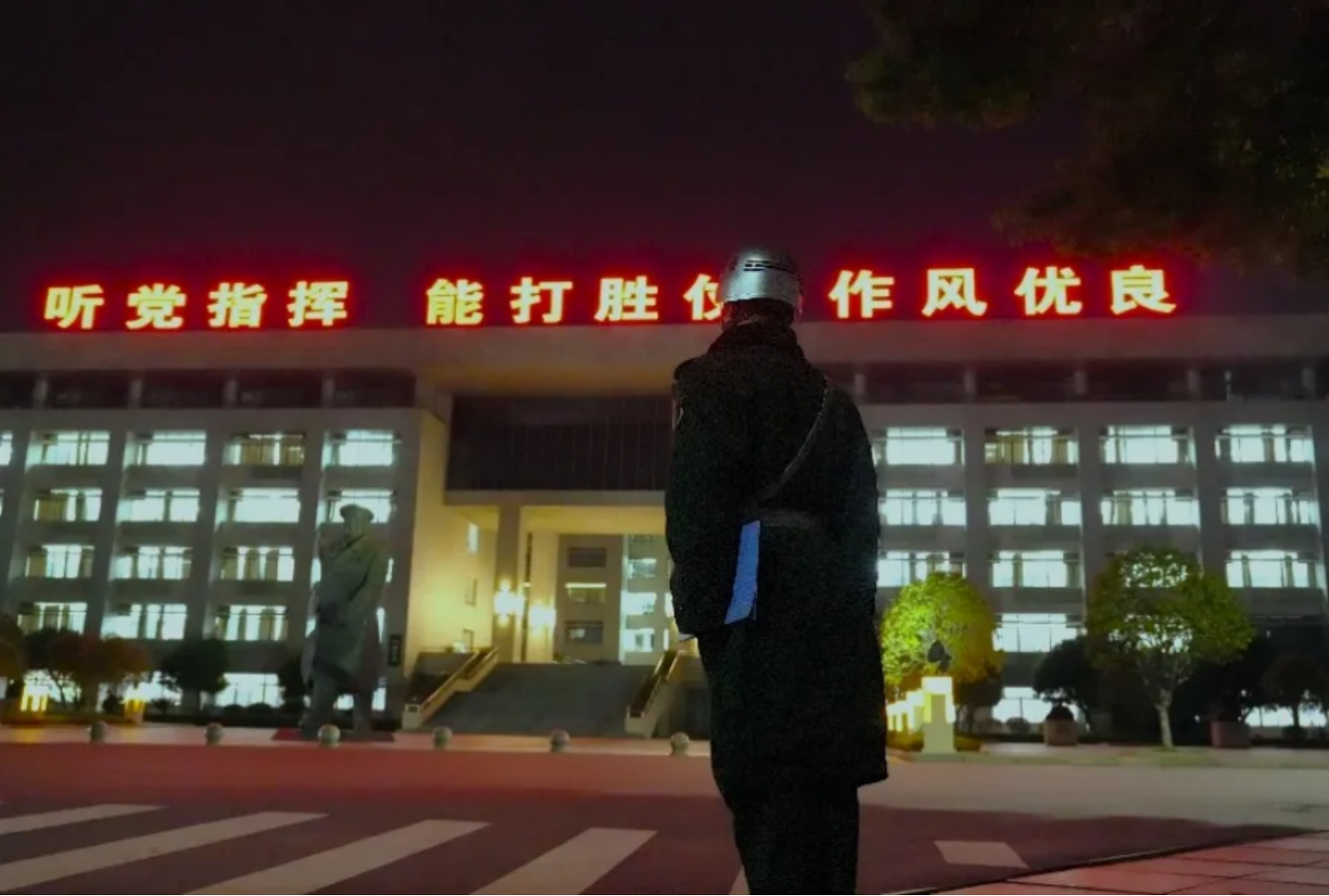 深夜,在顶灯的照耀下,“坚守哨位,无上荣光”八个红漆大字熠熠生辉。夜风挤进门缝,将某间宿舍传出来的翻身呓语裹进月光绵被,掖入整层楼均匀起伏的呼吸中去。值日员目光炯炯,依旧保持着清醒,牢记着无论何时无论何地都要站好每一班岗的使命担当。