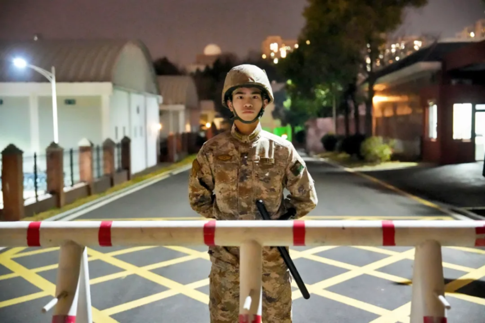 路灯的波纹在瞳孔里晕染,影子在沥青地面延展成五线谱,风的休止符缀在衣褶间。挺拔的身姿屹立在哨位处,脊椎与警戒线形成绝对垂直。当月轮悄然划过天际时,裤缝线仍与地砖缝保持着分毫不差的默契——这个永恒校准的基准点,始终锚定在安全线之上。
