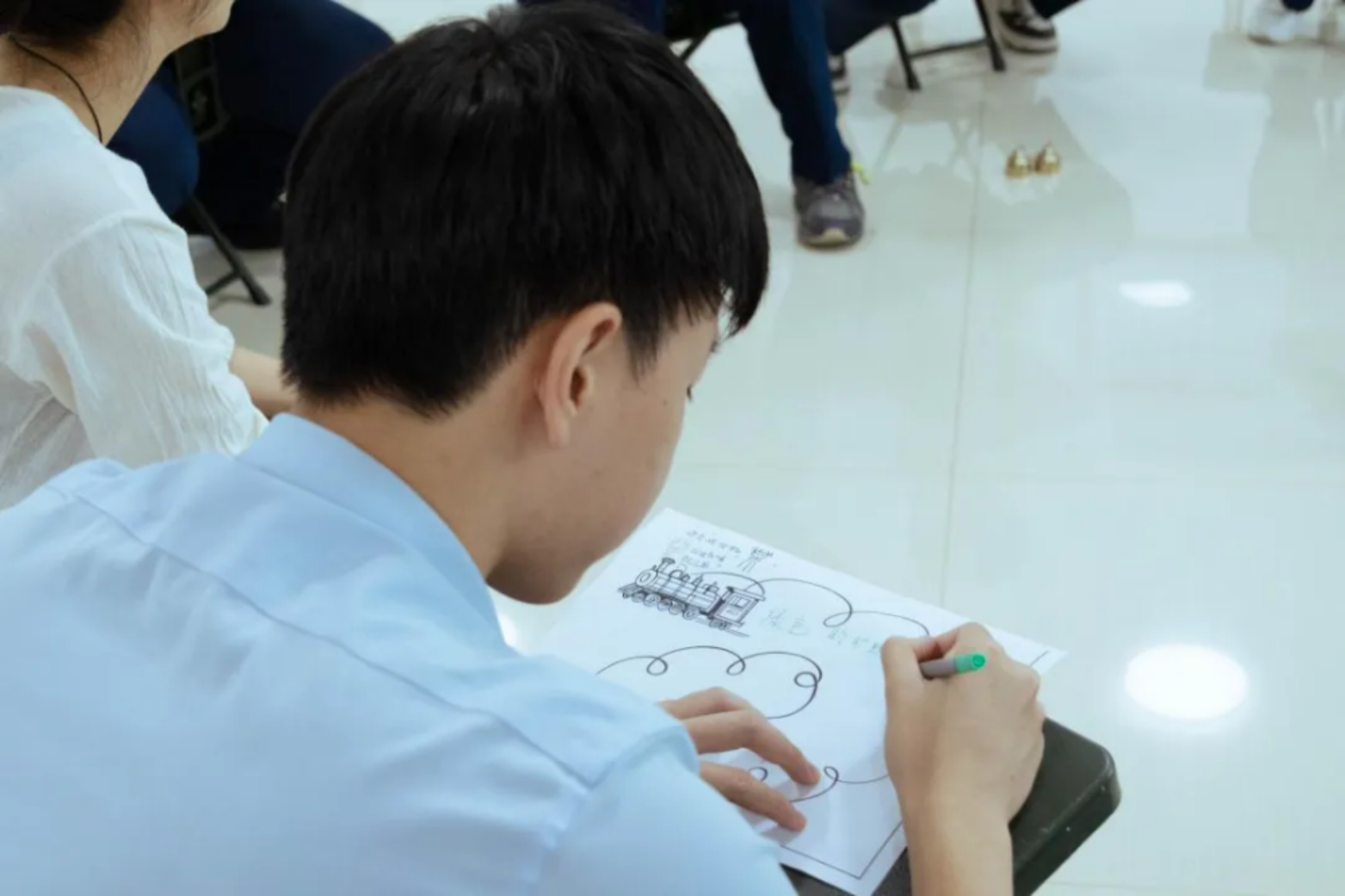 冥想结束后,教员邀请在座学员将自己想象到的画面用彩笔画下来,或者用几句话几个词来形容自己的感受。学员们手上拿着画笔,在“未来火车”上用线条与文字,勾勒属于自己的理想世界。