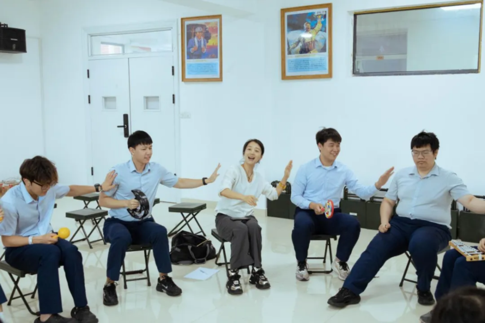 教员掏出乐器“百宝袋”,每位学员挑选自己喜欢的乐器,跟着音乐的节拍,随着教员打节拍、“动起来”,一起迎接“默契大挑战”。